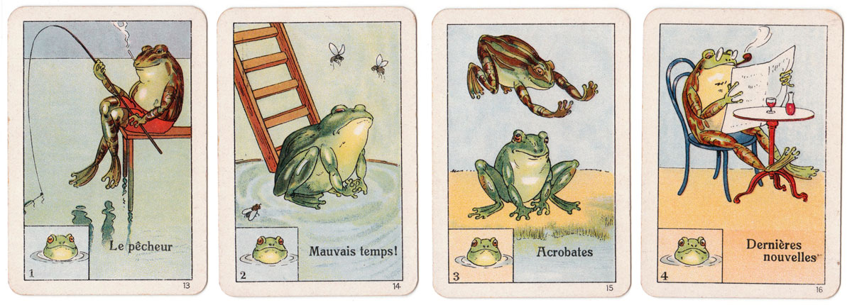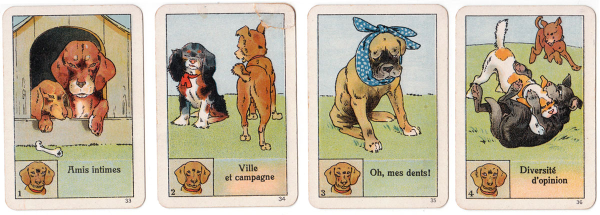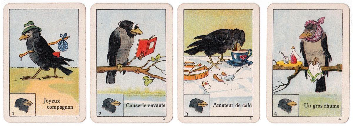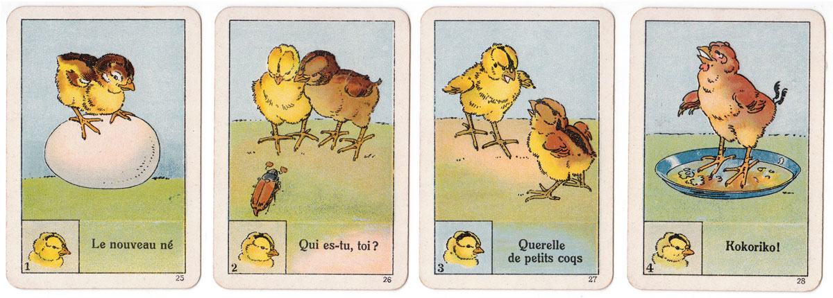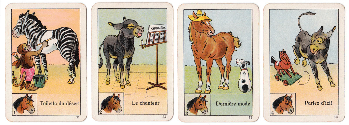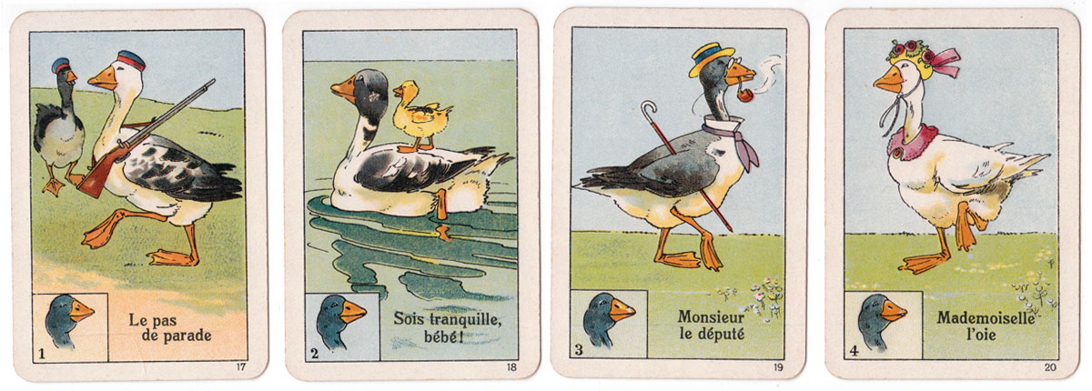This is the French language edition of a children's quartet game published by B. Dondorf, c.1900, consisting of 40 amusing illustrations of birds and animals with humorous captions... reminding us of the innocence of childhood. Each set is identified by a small picture in the bottom left-hand corner and numbered from 1 - 4; the entire pack is numbered consecutively from 1 - 40.