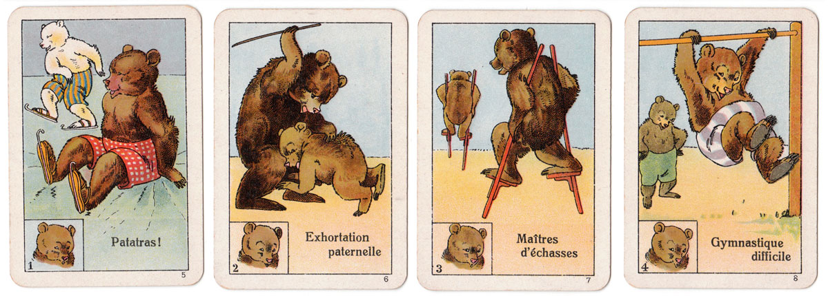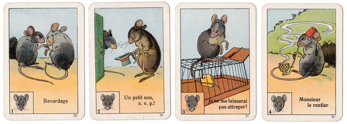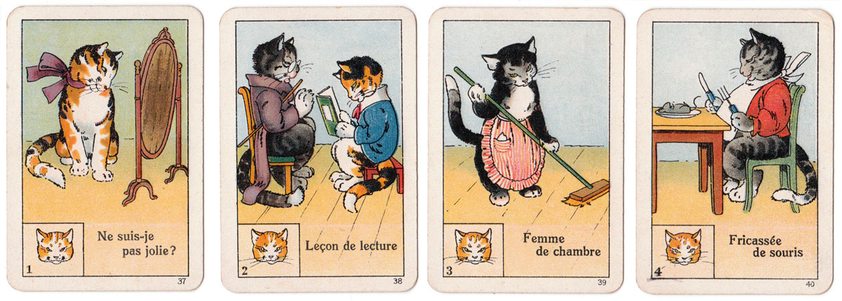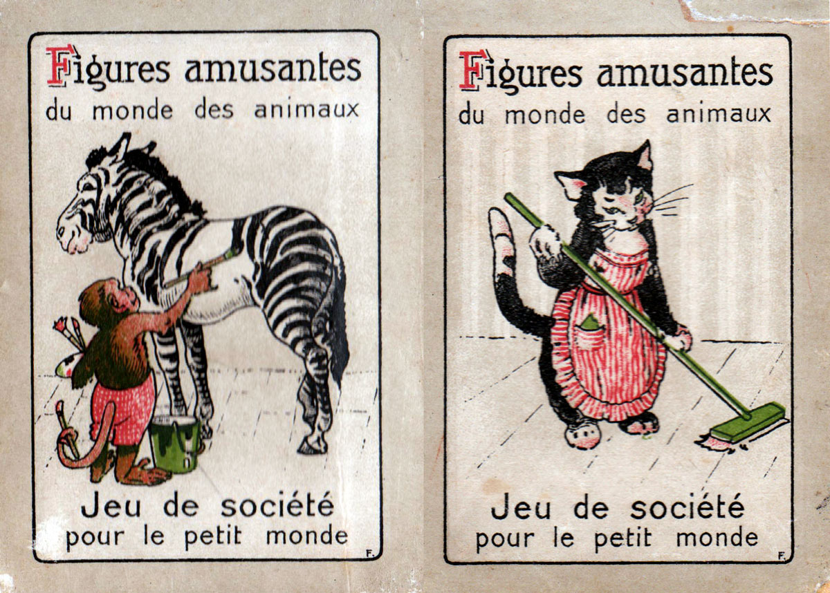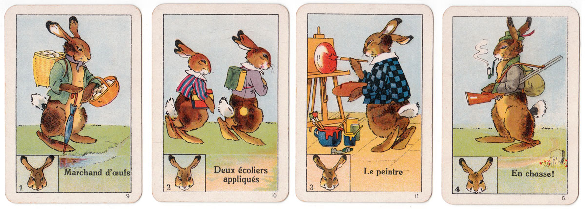 This is the French language edition of a children's quartet game published by B. Dondorf, c.1900, consisting of 40 amusing illustrations of birds and animals with humorous captions... reminding us of the innocence of childhood. Each set is identified by a small picture in the bottom left-hand corner and numbered from 1 - 4; the entire pack is numbered consecutively from 1 - 40.