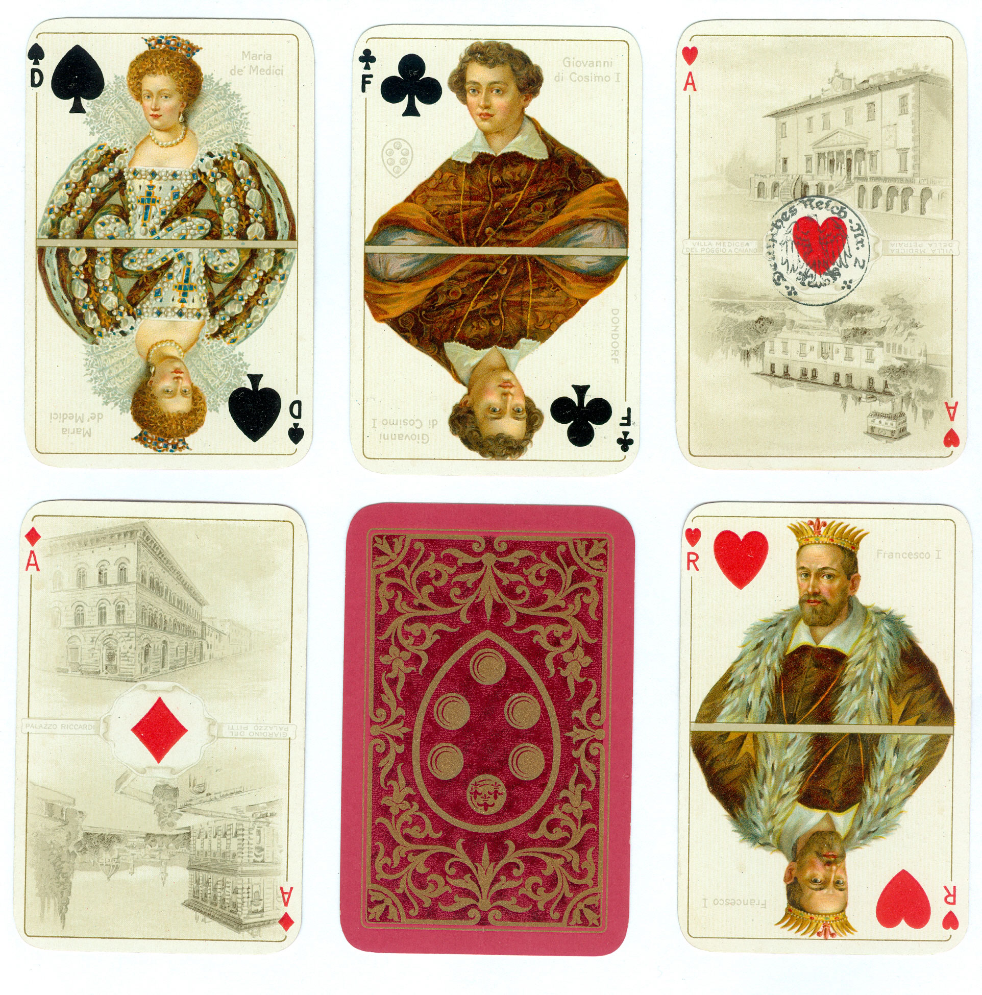 These finely lithographed playing cards printed by Dondorf GmbH derive their theme from historical and political events as well as the artistic patrons of the Italian Renaissance. The court cards depict members of the powerful Florentine dynasty of the Medici family taken from oil paintings by Bronzino, Sustermans and Pourbus: four Great Dukes with their families. The four double-ended scenic Aces and illustrate buildings relevant to the history of the Medici dynasty. The deck uses the French standard suit system in combination with original court figures and Italian indices (A, R, D, F) and was probably produced for the Italian market.