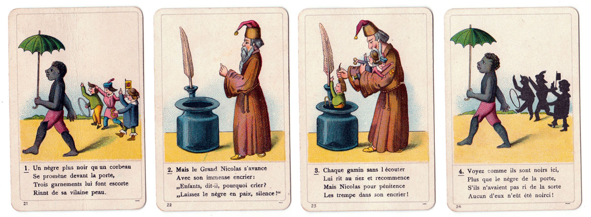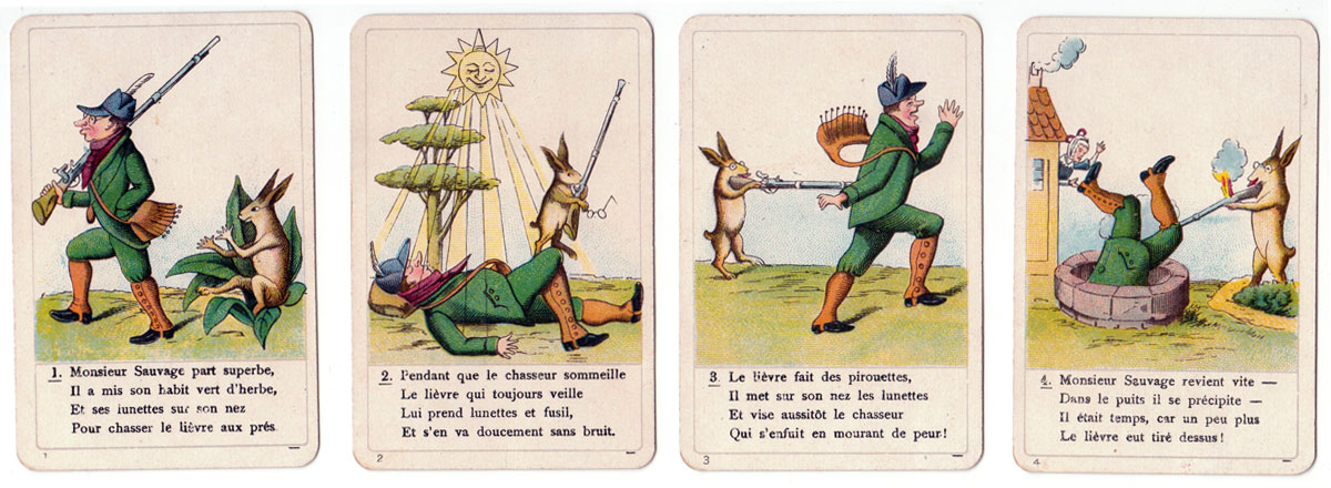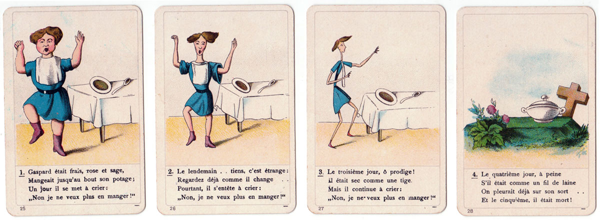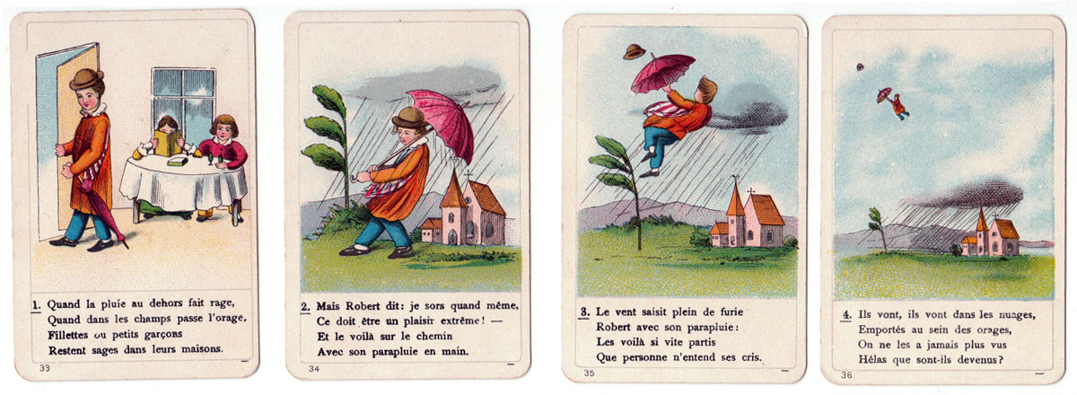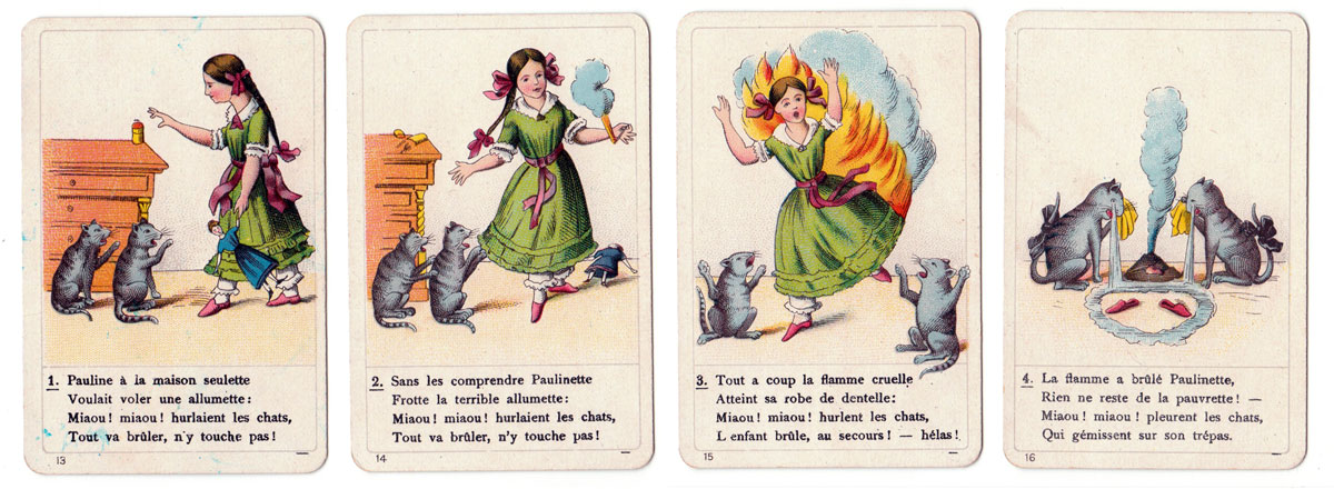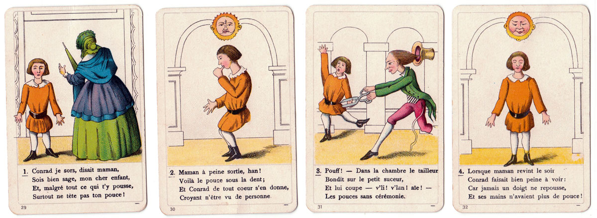 Above: the complete set contains 36 cards. The print quality and quality of the card and packaging are all excellent. According to the label on the box the game is authorized by the publisher as well as by the author, suggesting that it was first published before the death of Frankfurt psychiatrist and author Heinrich Hoffmann (1809-1894), who wrote the Struwwelpeter stories in 1847 for his son Carl. The Struwwelpeter stories quickly became famous in Germany and the success spread to other countries. The stories were translated into many languages→