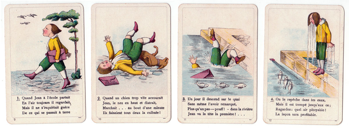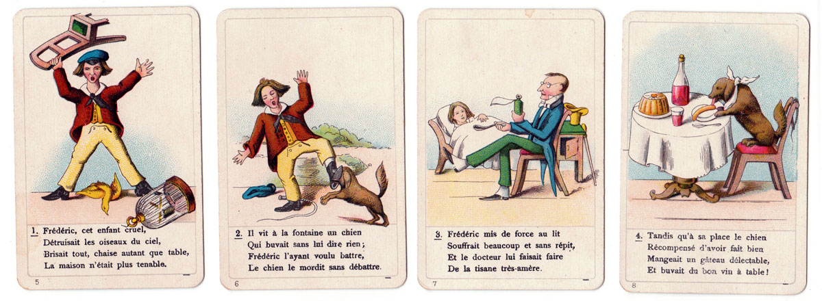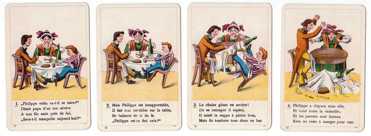 Alongside their magnificent range of luxury playing cards, Dondorf also produced a varied range of games for children. This example based on the “Der Struwwelpeter” stories first published in 1847 was evidently made for export to Holland, Belgium and France as it is accompanied by bi-lingual instructions. It was published in UK by A.N. Myers in c.1890. The game contains 9 sets of four cards numbered consecutively. Each set is like a comic strip with a moral lesson, telling a story about a naughty child who gets into trouble for such things as disobeying their parents, bad table manners, harming animals or making fun of foreigners.