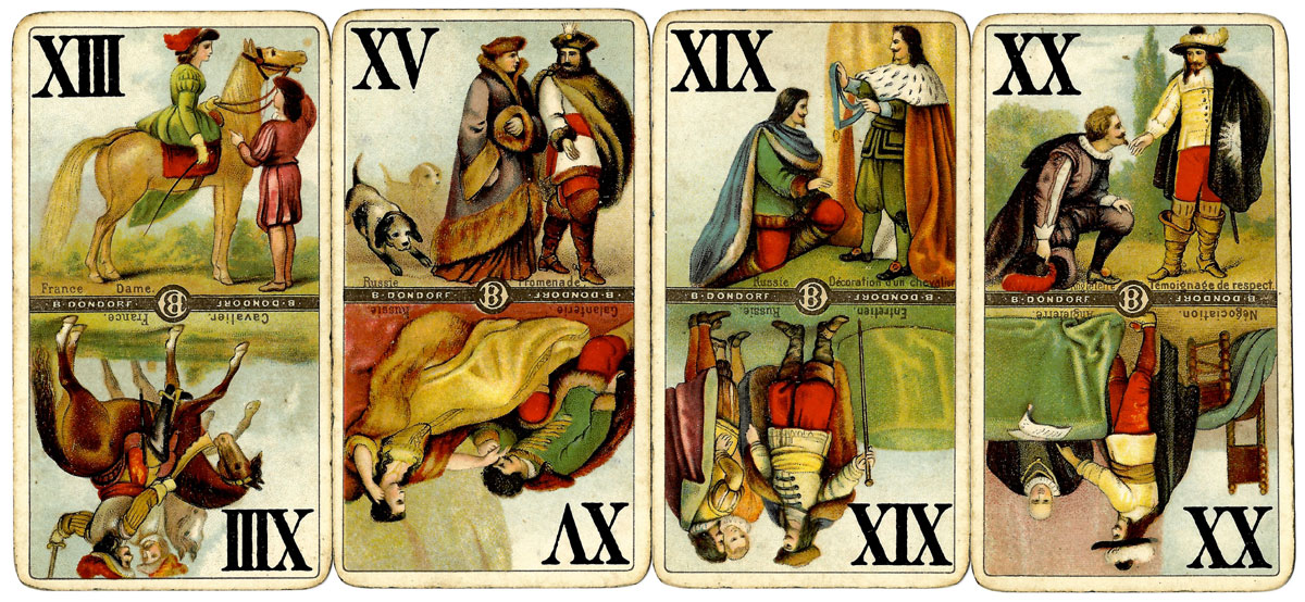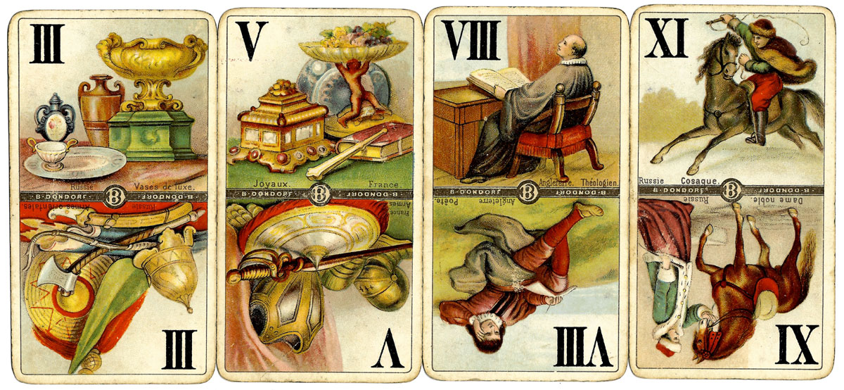 Above: eight trump cards from chromolithographic edition of Dondorf's “Microscopique Tarock“, rounded corners, c.1905-33. Below: the same cards reversed, showing the different scenes at each end. Images courtesy Barney Townshend.