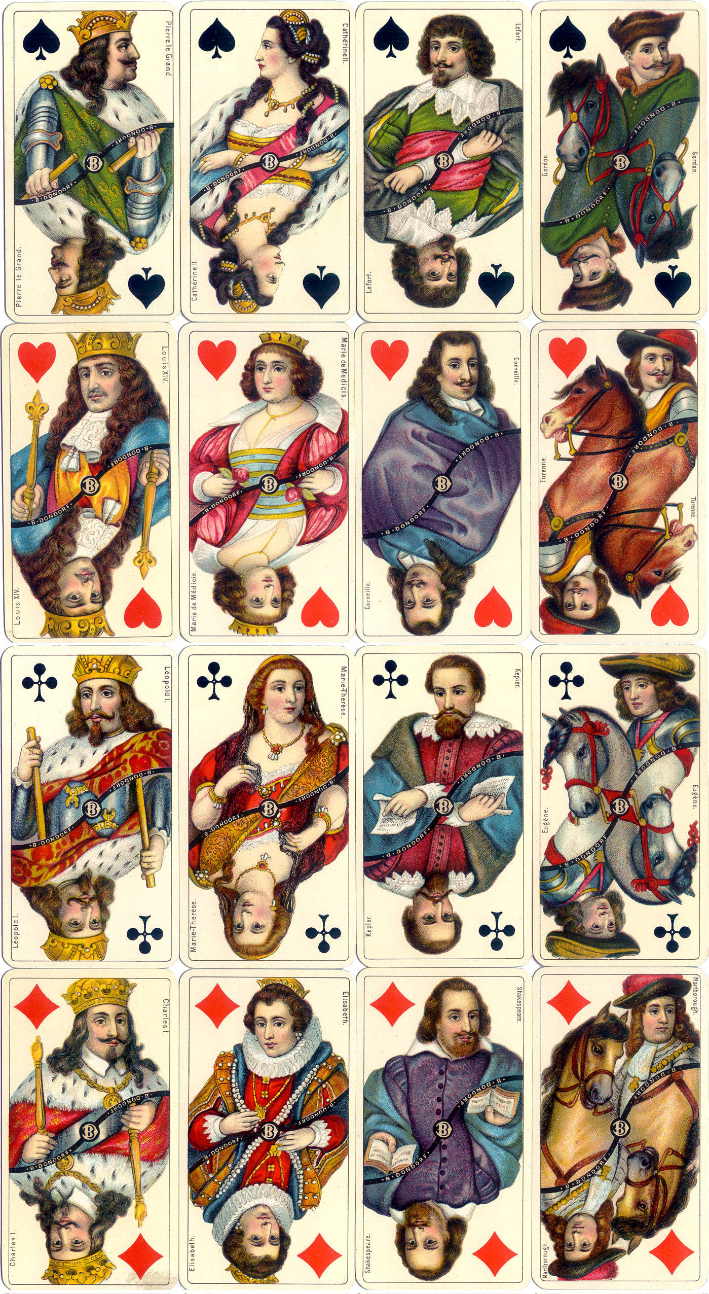 The four suits are associated with four countries: Clubs = Germany, Diamonds = UK, Spades = Russia and Hearts = France. Whilst the four pictorial Aces show nationally symbolic buildings from each country, the court cards depict eminent persons. See also: The Trumps • The Four Aces.