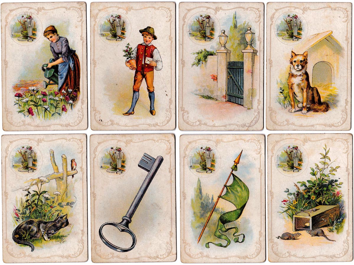 The pack is divided four series of 10 cards, as shown in the table below, and each series has equivalent titles (key, cat, dog, etc) making ten sets of four cards. Each series also has its own miniature indicator at top left-hand corner and a different colour ribbon around the picture. These are a bit scruffy but it’s the only pack I have ever seen. The game is played akin to Happy Families. See the Rules►