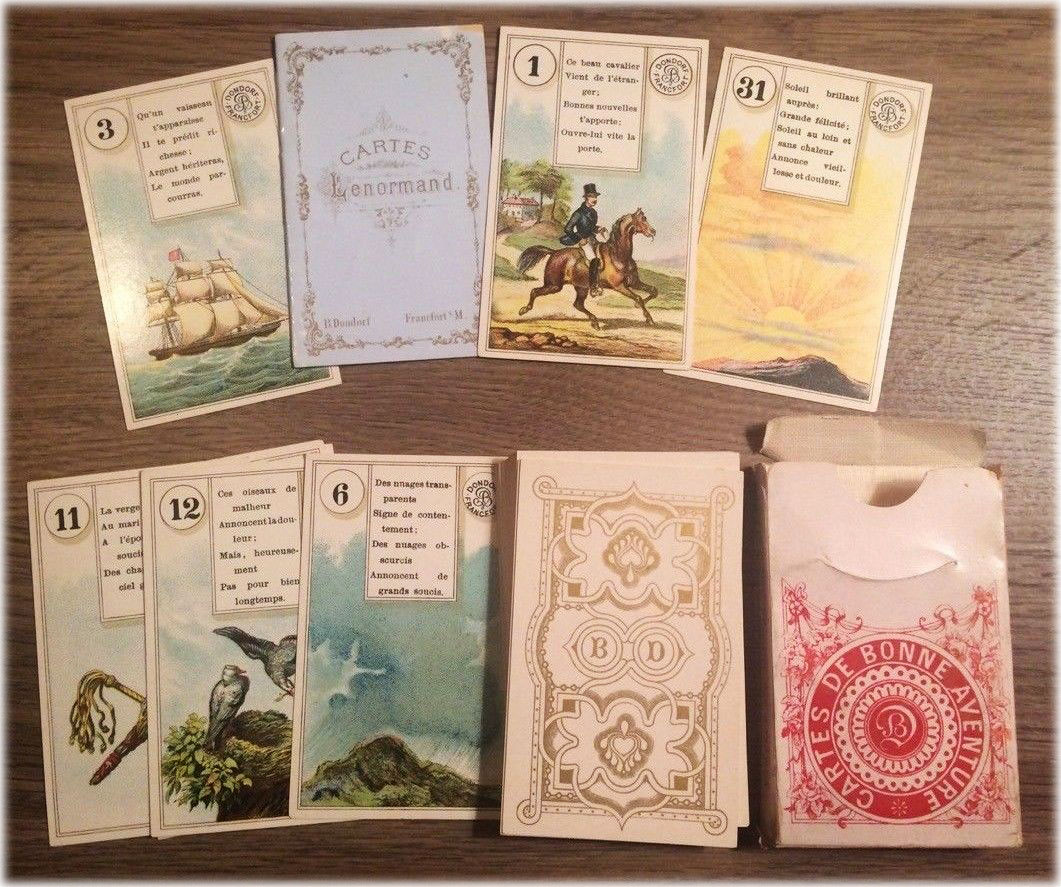 Lenormand cards have always been popular. They read in a very practical everyday way, gypsy-style. There's less room for interpretation, their reading style is very direct. There's no metaphysical or psychological layer, the way there is with Tarot. They were published in French as “Cartes de Bonne Aventure”. They are published today in a variety of languages and styles.