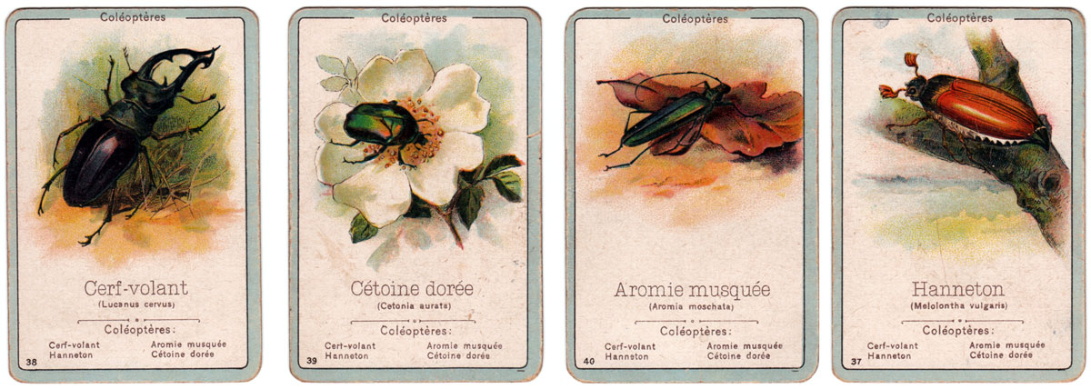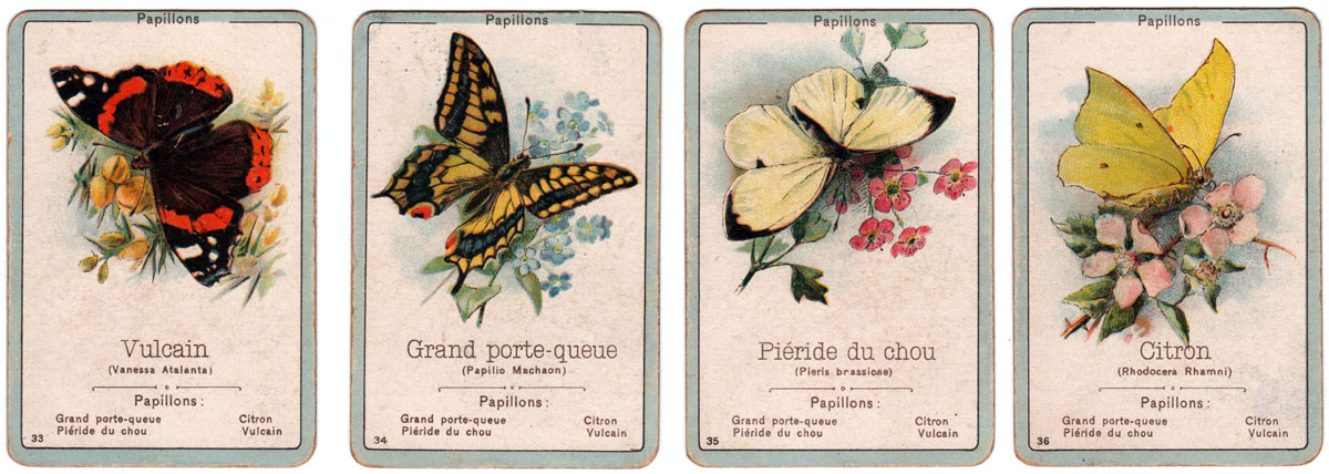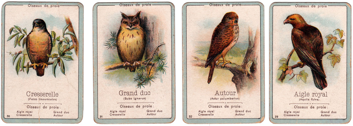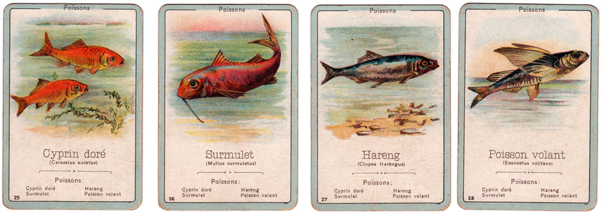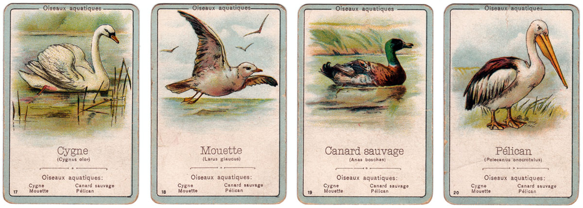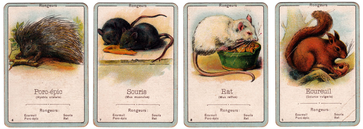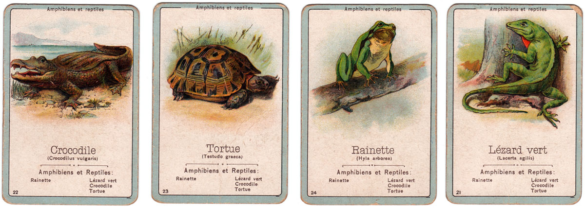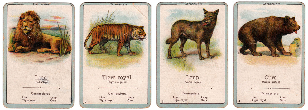 Above: Dondorf's “La Zoologie” no.335 is an informative and edifying card game featuring a collection of 40 species of animals from around the world, including quadrupeds, rodents, reptiles and amphibians, plus a selection of fish, butterflies and birds of prey. In the spirit of late 19th century study of natural history, the animals are given their latin names as well as grouped into zoological families. It is of course these sets which make the game suitable to play “Happy Families” or Quartets, as well as imparting the basics of scientific zoology in accordance with Darwin's theories. Hence on the title card (right) we read: “Jeu de société récréatif et instructif”. See the box.