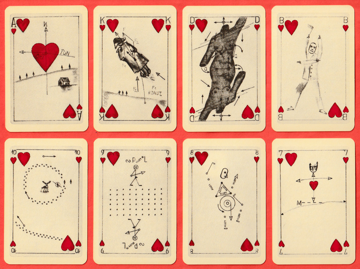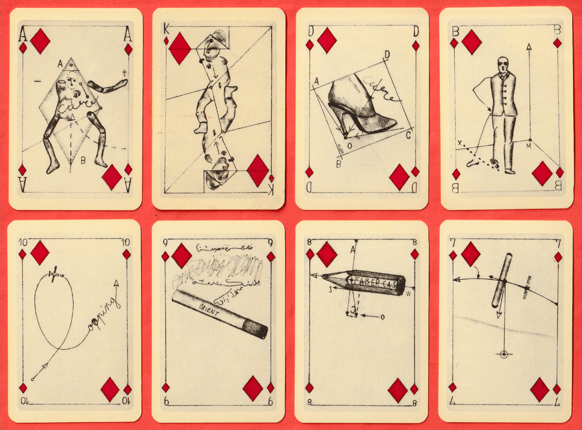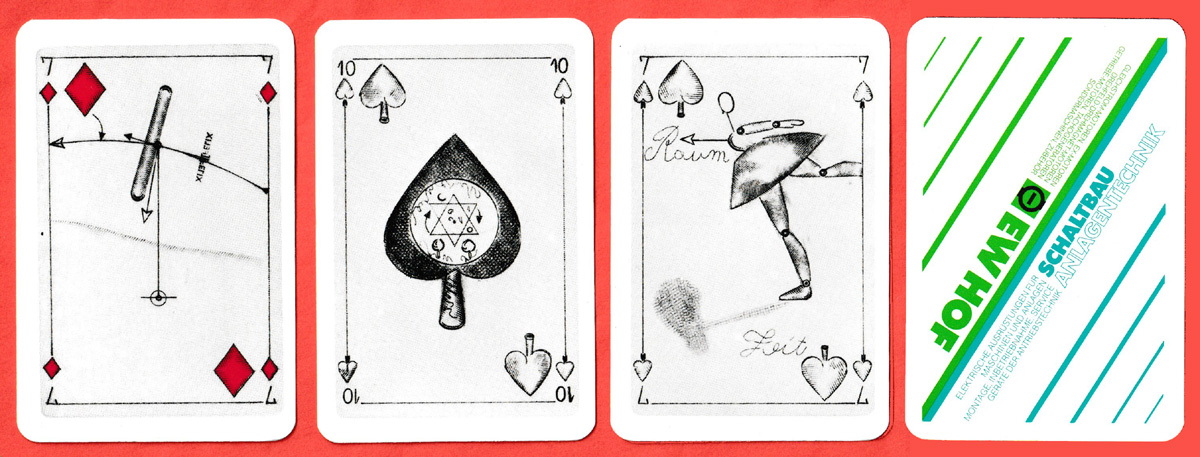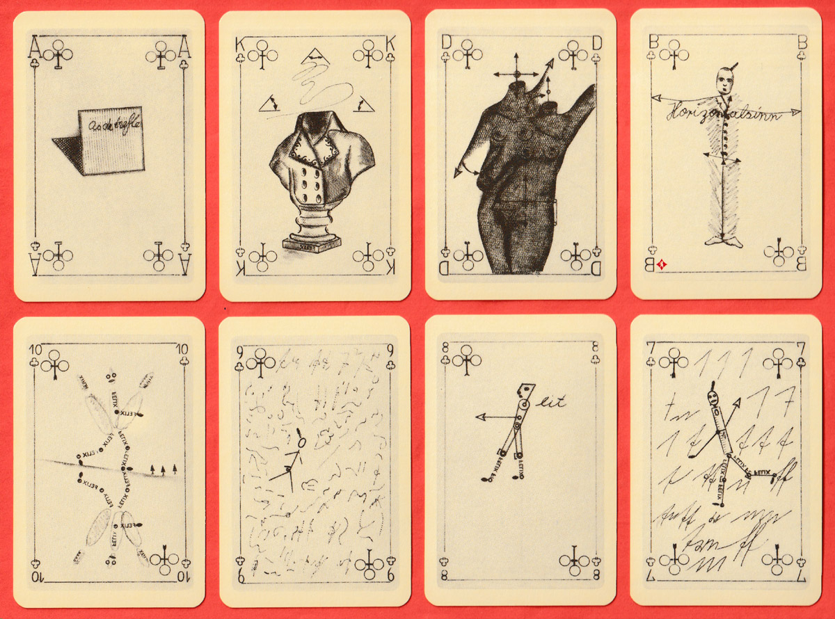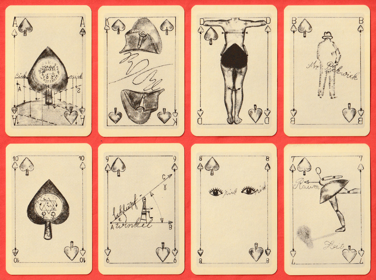 Above: escART skat deck illustrated with etchings by Johannes Vennekamp, made by Berliner Spielkartenfabrik GmbH & Co., Darmstadt, for Galerie Steinrötter, Münster, Germany, 1978. 32 cards. Size: 59 x 90 mm. The original version was produced in an edition of 1,000 packs.