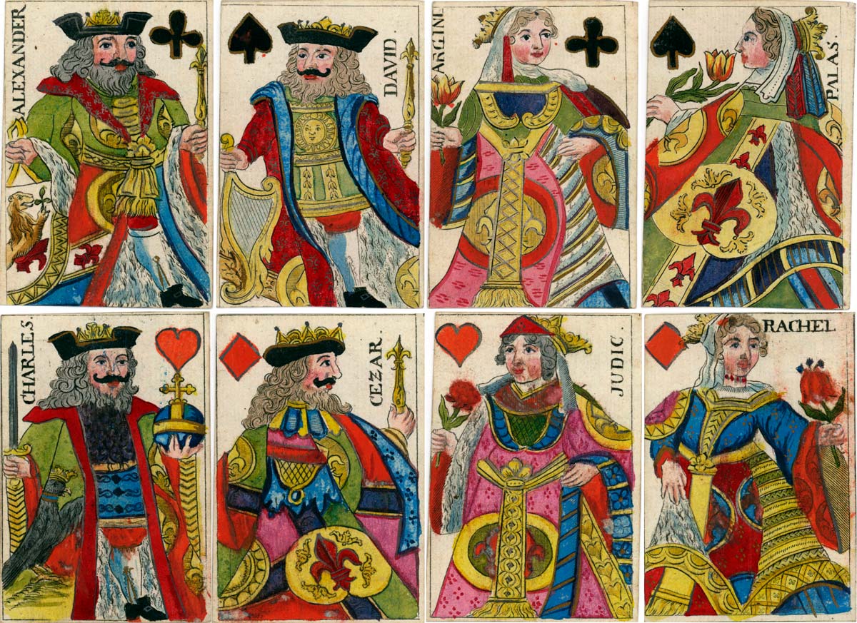 The French “Paris pattern” was established as such around the middle of the seventeenth century (based, perhaps, on the cards of Hector of Troyes). The cards had single-figure courts until around 1830 when the double-ended version came into use. The court cards are usually named. French-suited cards arrived in Germany during the 18th century and many beautiful French-suited packs were produced in Germany, including some local variations derived from the Paris pattern. In some cases the manufacturers incorporated Austro-Hungarian eagles into the designs of this pattern, whilst others retained the fleur-de-lis as well as the French names on the courts. This pattern was superseded in Germany by the rise of the Hamburg pattern.