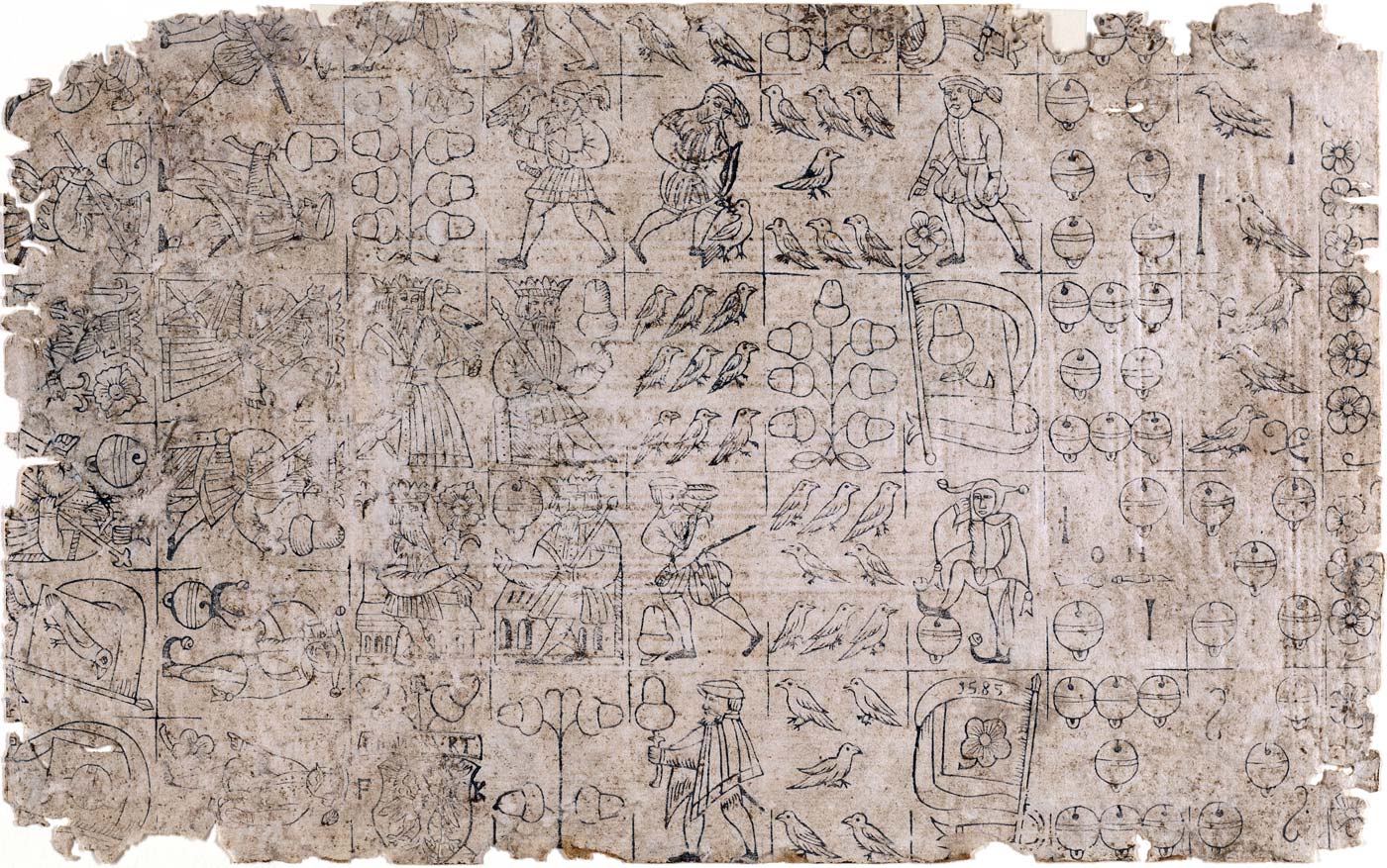 Above: archaic German cards by Heinrich Hauk, dated 1585. The suit symbols are: acorns, bells, birds and flowers. Beinecke Rare Book and Manuscript Library, Yale University: GER sheet 249►