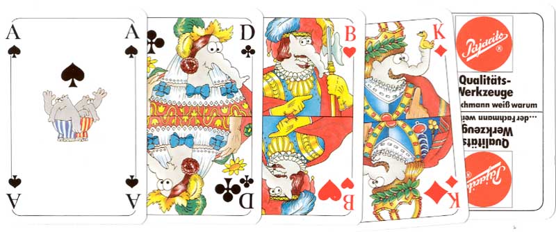 Stuttgart Pack • Princely Hunting Pack • Master of the Playing Cards • Hofämterspiel • Hans Beham, 1523 • Heinrich Hauk, 1595 • I.M.F. Engraved Cards, 1617 • Thomas Murner • Peter Flötner • Early German Engraved Cards • The South German Engraver • Book of Trades • Master PW Circular Cards, c.1500 • Geistliche Karten, Augsburg, 1718 • Johann Jobst Forster • Old Bavarian pattern • Joseph Losch, c.1800 • Joh. Matheus Backofen, c.1800 • ‘Prague’ or ‘Bohemian’ pattern • Saxon pattern • Victory Deck, c.1815 • Anti-Napoleon Deck, c.1815 • Bergmannskarte, c.1816 • Cartomancy Deck, c.1818 • C. A. Müller “Antike Götter”, c.1830 • C.L. Wüst • Schiller Deck, C.L. Wüst, c.1830 • Wüst Swiss Album Patience • C.L. Wüst: Brazil Scenic Aces • Bourgeois Tarot • Mlle Lenormand Cartomancy Cards • North German pattern • Verkehrte Welt Tarock, c.1850 • Johann Jegel's Historical Deck, c.1850 • Bavarian Military Cards • Bavarian pattern • T.O.Weigel: Luxus Skatkarten, c.1860 • Narren-Karte by C. H. Reuter, c.1860 • Neue Deutsche Spielkarte, c.1883 • Deutsches Schützenfest 1884 • Liebig Beef Extract, 1891 • Prussian Pattern • B. DONDORF (1833-1933) • F. A. LATTMANN • Wilhelm Busch Comic Card Games • Otto Tragy Jugendstil Spielkarten • Badische Spielkartenfabrik • Walter Scharff • Sinalco advertising • Bambi playing cards • Schmid Argentina S.A. • Pajarito Skat • Veltins Skat • Fussball Skat • Schwäbisch Hall, c.1975 • Financial Times • Bosco playing cards made for Perú> • Birkel Schwarzer Peter Circus game • Klipp Klapp Karten, 2004 • British Channel Island Ferries