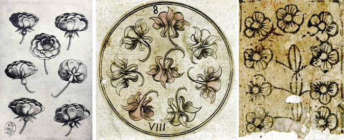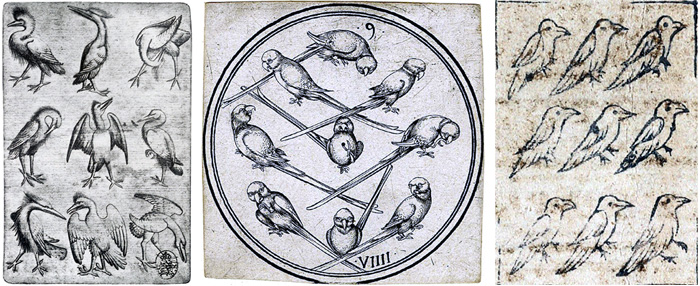 Above: birds and flowers as suit signs in cards by the Master of the Playing Cards, Germany, c.1455; the Master PW, Cologne, c.1500; and by Heinrich Hauk, Frankfurt c.1585.