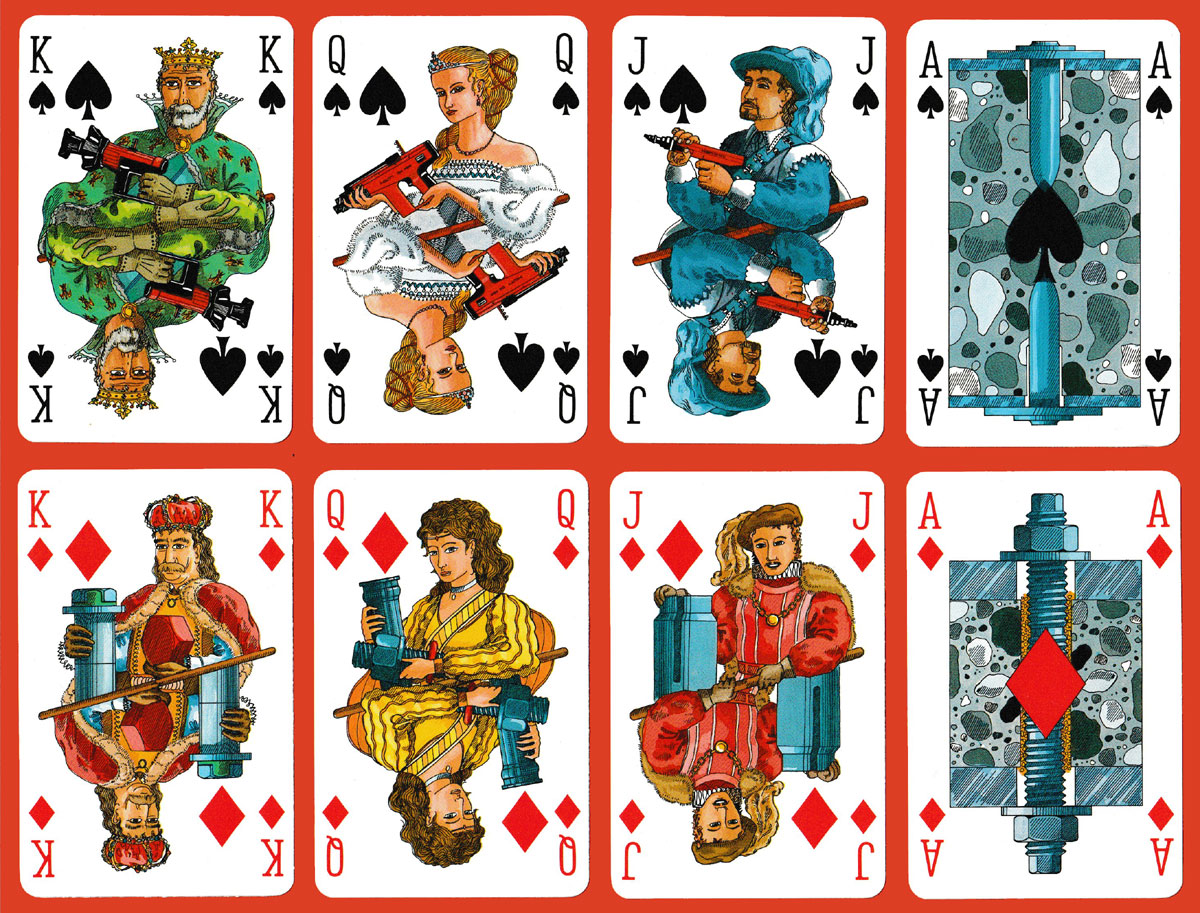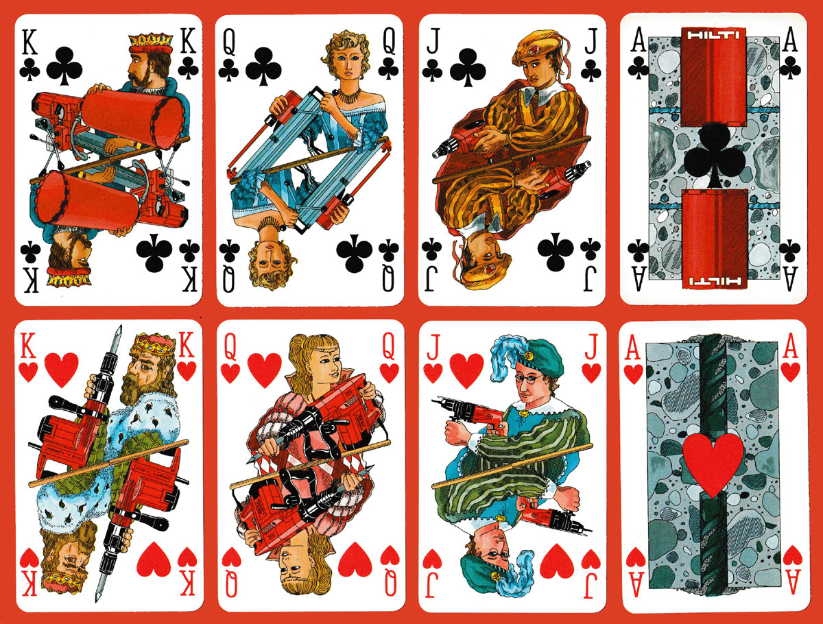 Hilti AG is a Liechtenstein-based company that develops, manufactures, and markets products for the construction, building maintenance, energy and manufacturing industries. Incongruously, the double-ended courts in this pack are shown holding different modern power tools while at the same time wearing medieval costume. One wonders whether they really know how to hold them! Other pieces of equipment have been used in place of all the pips on the numeral cards, repeated the appropriate number of times to correspond with the value of each card. Two slightly different back colours were produced. See the boxes