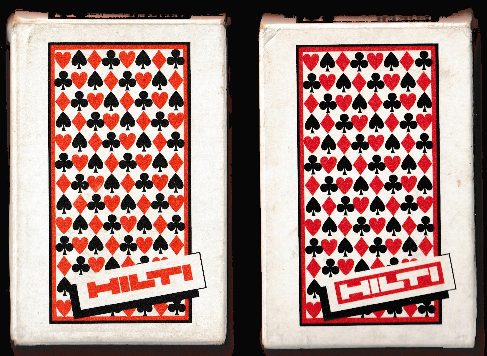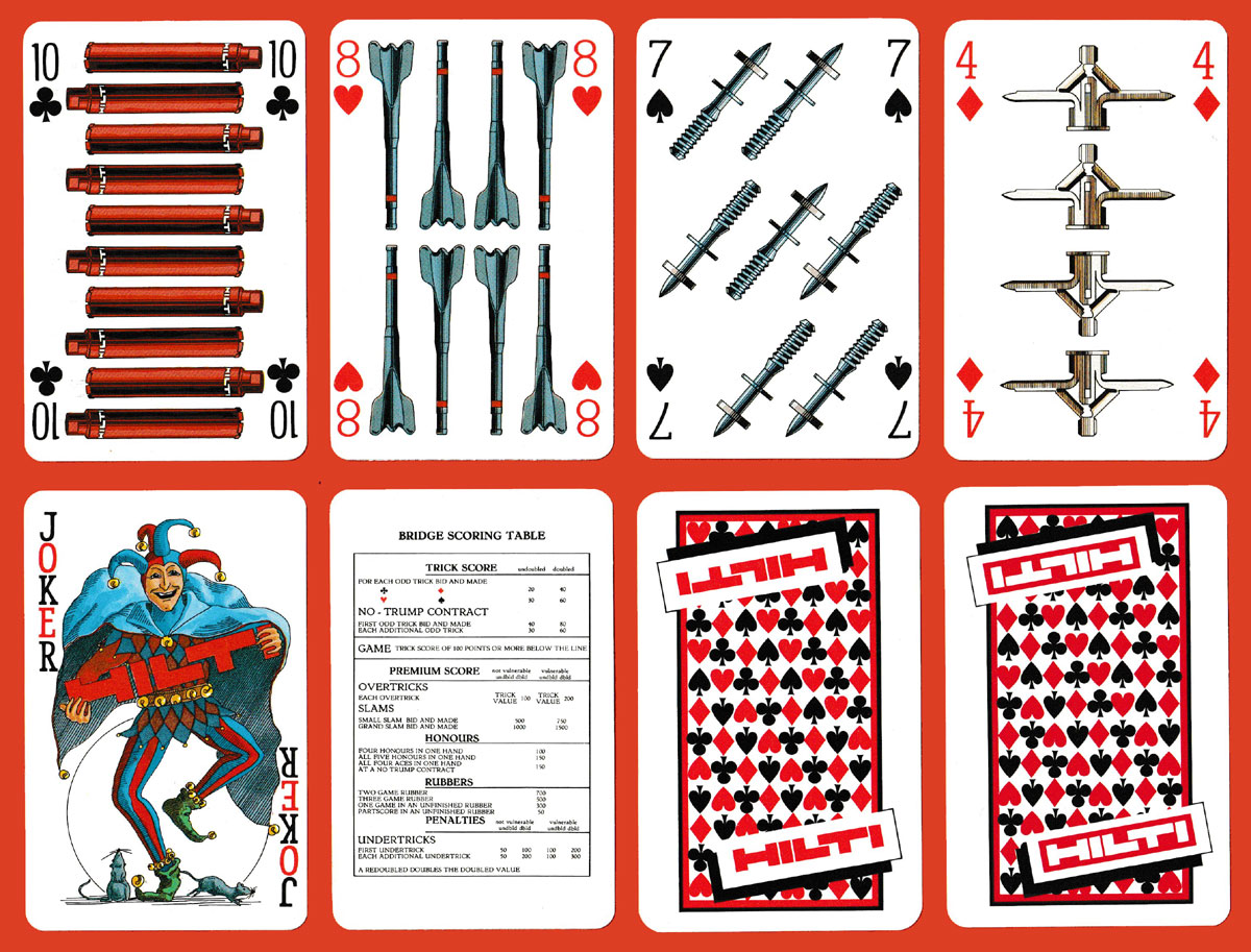 Above: promotional pack made by Berliner Spielkarten GmbH, Darmstadt, Germany, for Hilti AG, Schaan, Liechtenstein, 1985. 52 cards + 2 (identical) Jokers + 1 bridge scoring card in tuck box. Size: 57 x 89 mm.