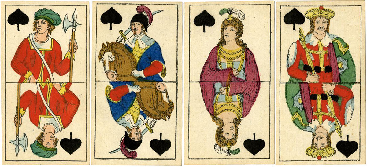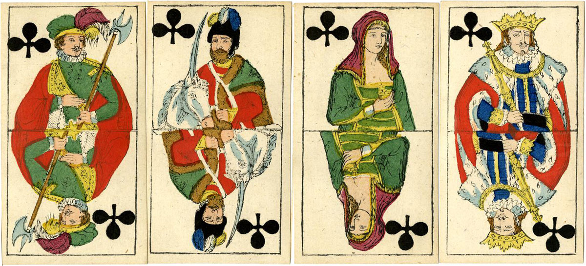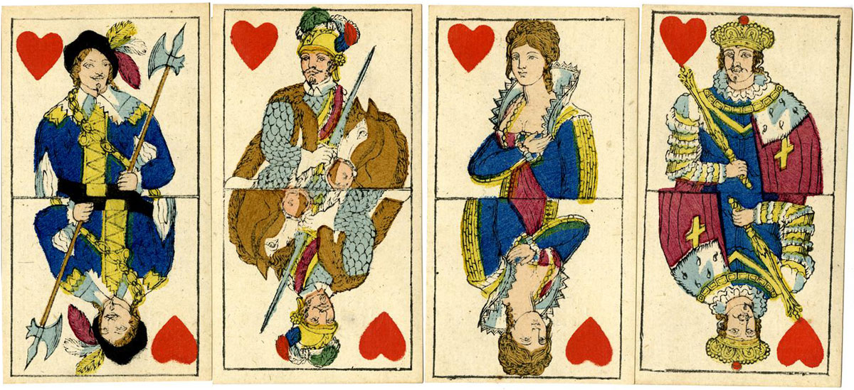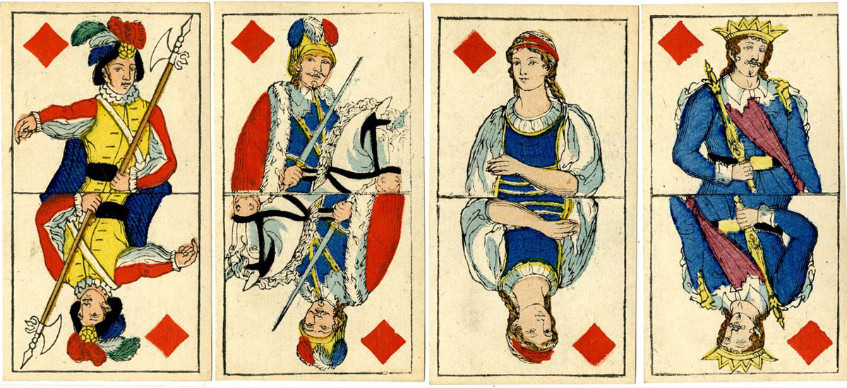 Above: French-suited Æsop's fables tarot by Leipzig Industrie Comptoir, hand-coloured lithograph, backs printed in dull red with a pattern of stars and dots, circa 1800-1825. Hand-coloured lithograph, 108x58mm. © The Trustees of the British Museum • Museum number 1876,1014.1211-1288►
