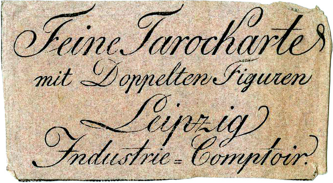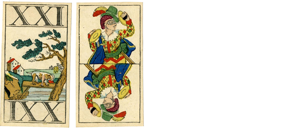 French-suited tarot titled “Feine Tarockartes mit Doppelten Fuiguren Leipzig Industrie Comptoir” on the wrapper, c.1800-1825. The 22 trumps, with large roman numerals at top and bottom of each card, illustrate some of Æsop's well-known fables and other short stories that feature animals with human-like qualities and convey moral lessons. This is a new artistic development from the normal Animal Tarots of the 1750s which aligns with trends in cartomancy and tarot - all new ideas eventually blend and influence each other. Even the court cards are in a new, modern style of costume compared with older models. The only card representative of the old emblematic tarots is the double-ended fool or unnumbered card.
