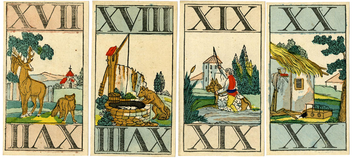 Reference may be made to number II which illustrates the fable of “The Boy who cried Wolf” • V represents “The Rabbits of Fontaine” • VI “The Fox and the Pitcher” • VII “The Fox and the Crow with the Piece of Cheese” • X The Stag and the Stream • XI The Wolf and the Crane • XII The Fowler and the Wolf • XIII The Gourd and the Pine • XIV The Stork and the Frogs • XVI The Men and the Bear • XVIII The Frog and the Well • XXI The Dog and his Shadow • the unnumbered card,, or Fool, is a bust of a harlequin holding cymbals.