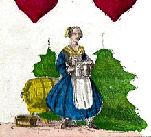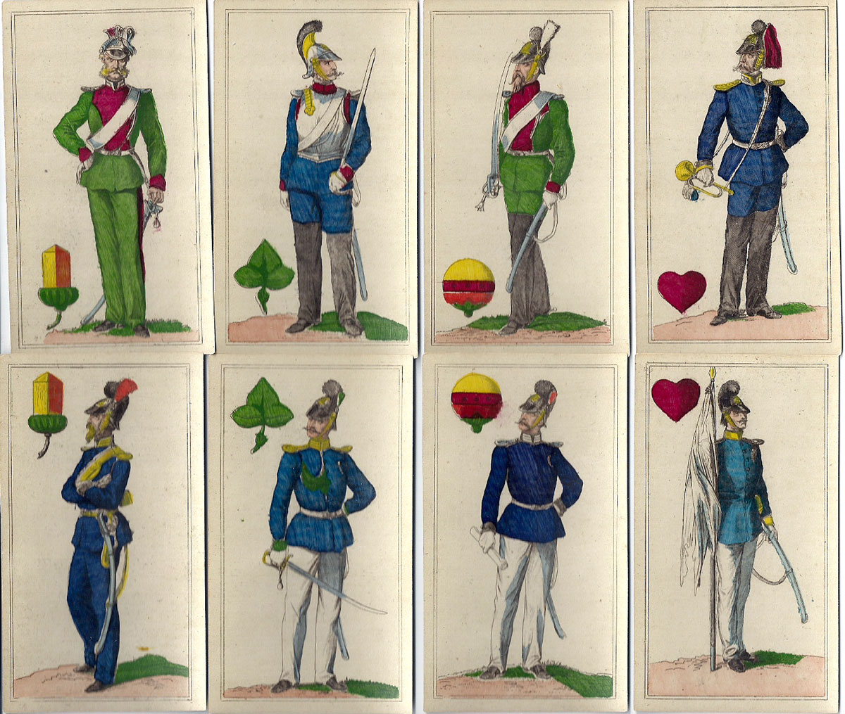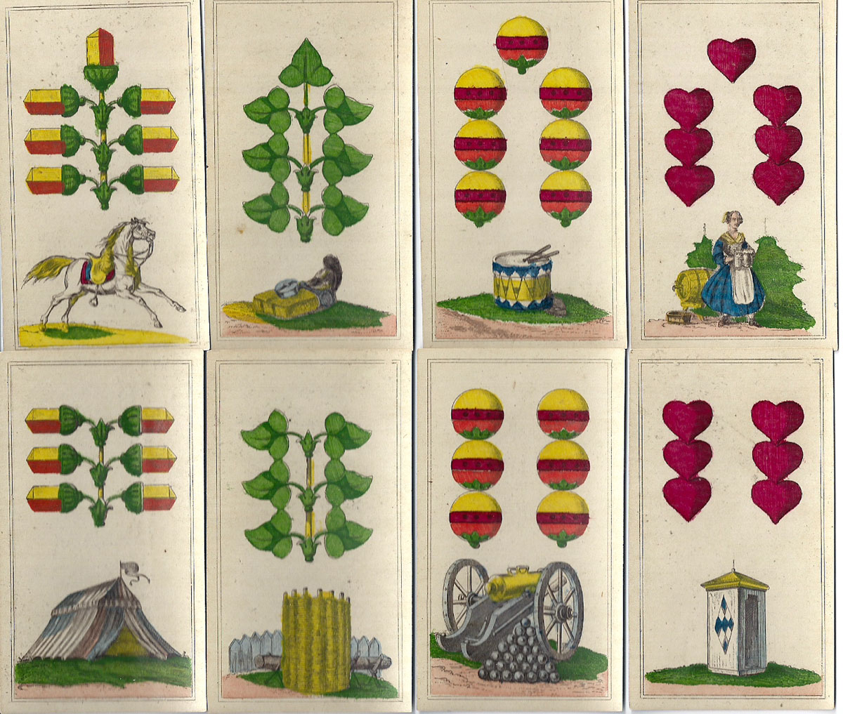 The bright images on these finely engraved patriotic playing cards with a military theme are coloured with stencils. The uniforms are coloured in mainly green and blue, and the Kings are not actually wearing their crowns. The King of Acorns is supposed to represent Crown Prince Otto I; the King of Leaves is Maximilian II; the King of Bells is Ludwig II; the King of Hearts is Ludwig I wearing a general's uniform. The court cards are all male, but some of the numeral cards depict women as well as military objects. This appears to be a later edition produced after 1879 by Johann Wilhelm Sass, who succeeded J C Jegel in 1857.