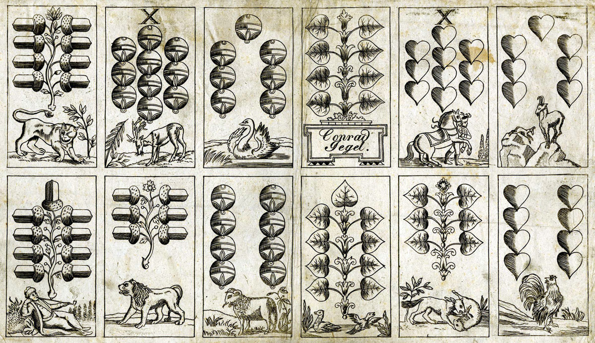 Above: uncut sheet containing 12 playing-cards produced by Conrad Jegel between 1874-c.1885. Size of sheet= 245 x 362 mms. The cards are the 6, 8 and 9 of acorns and leaves, and the 7, 8 and 10 of bells and hearts. On the 8 of leaves is a tablet inscribed "Conrad Jegel". © The Trustees of the British Museum • museum number 1896,0501.1118►