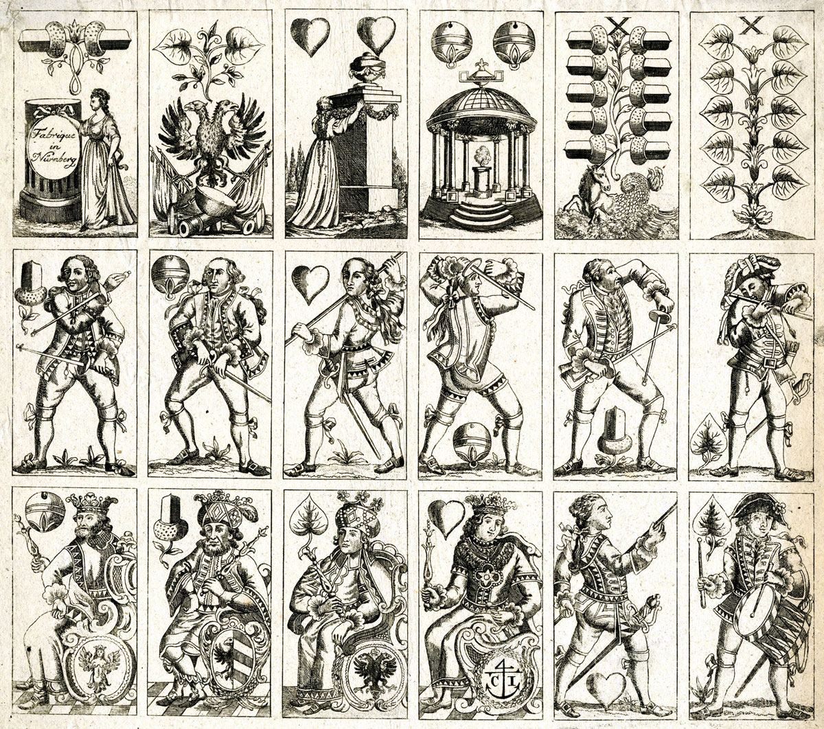 Twelve court cards, the four deuces, and the tens of acorns and leaves from an engraved proof sheet, uncut, possibly discarded due to imperfection or soiling. Uncoloured. The deuce of acorns has a lady standing by a column which is inscribed “Fabrique in Nürnberg”; that of leaves a double-headed eagle on a military trophy. The deuce of hearts has a lady adorning a monument; that of bells a temple with an altar. The 10 of acorns has a unicorn sea monster.