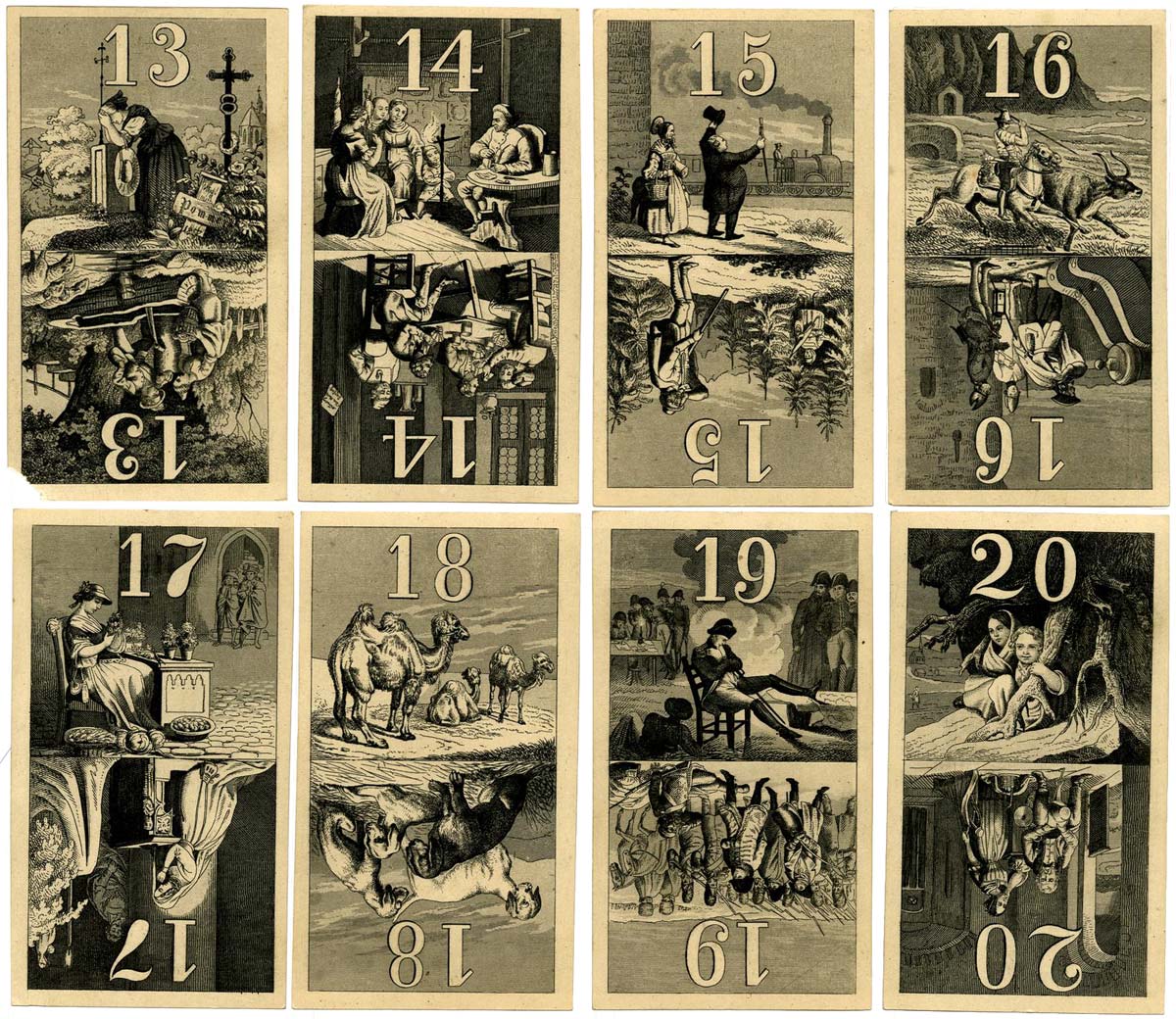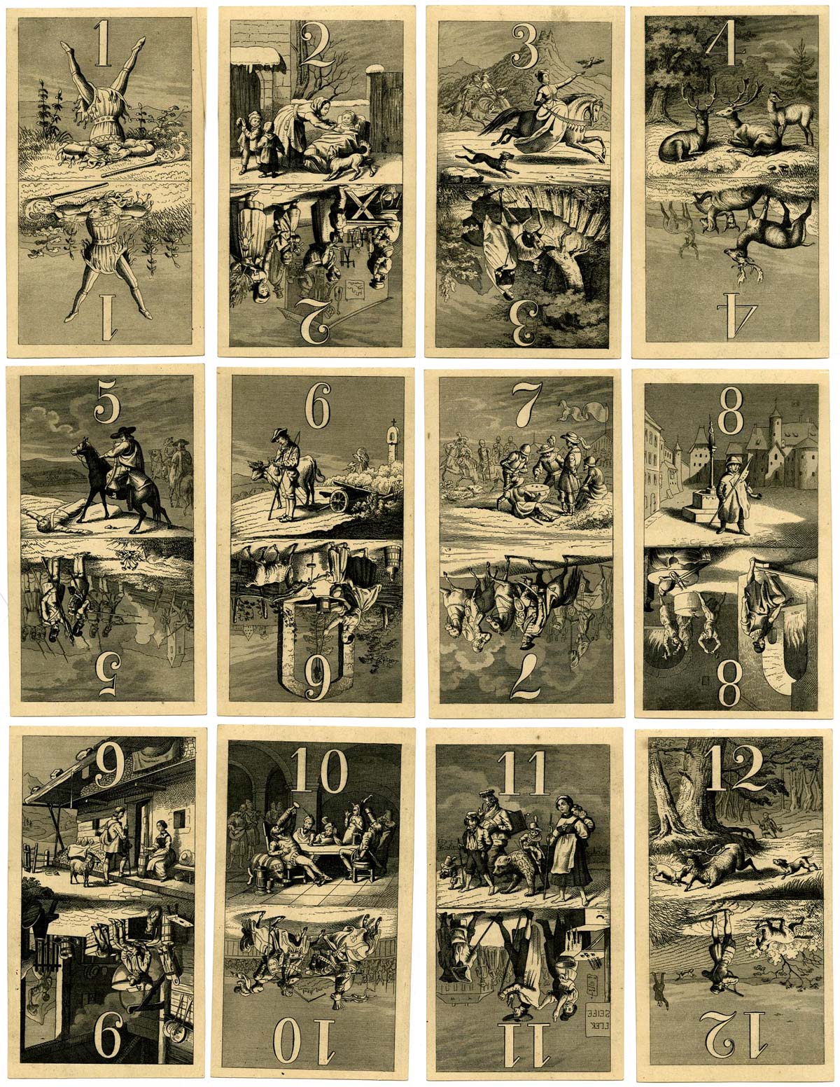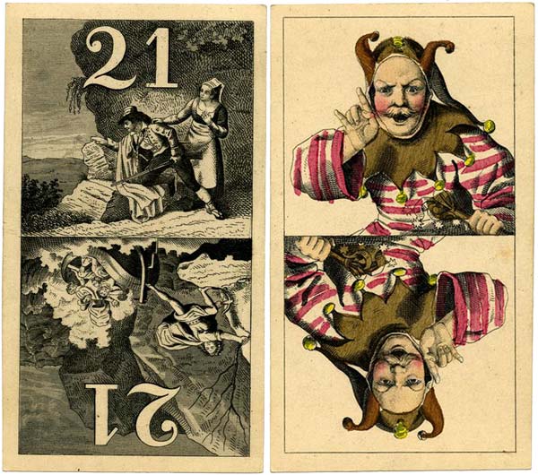 French-suited Pomeranian Tarot deck with neat etchings by Georg Pommer (fl.1815-1854) published by Johann Conrad Jegel, 1852. 78 cards, hand-coloured etchings. The trump cards have different designs at each end, numbered in large open Arabic numerals within the composition. All the tarots are uncoloured with the exception of the fool which is a double bust of a man with cap and bells, neatly coloured. No.15 is a stout gentleman hailing the train on a railway. No.19 represents Napoleon I the night before the battle of Austerlitz. The design on number 13 depicts a young girl in sorrow at a tomb, near which is a monumental cross with "Pommer 1852". The double-ended court cards are coloured. © The Trustees of the British Museum • Pomeranian Tarot►