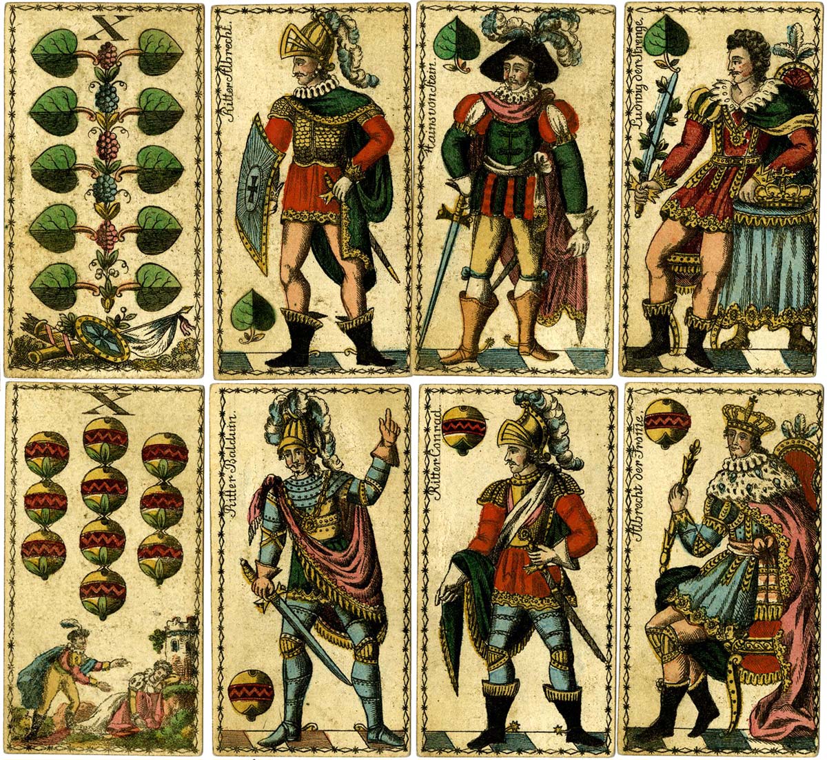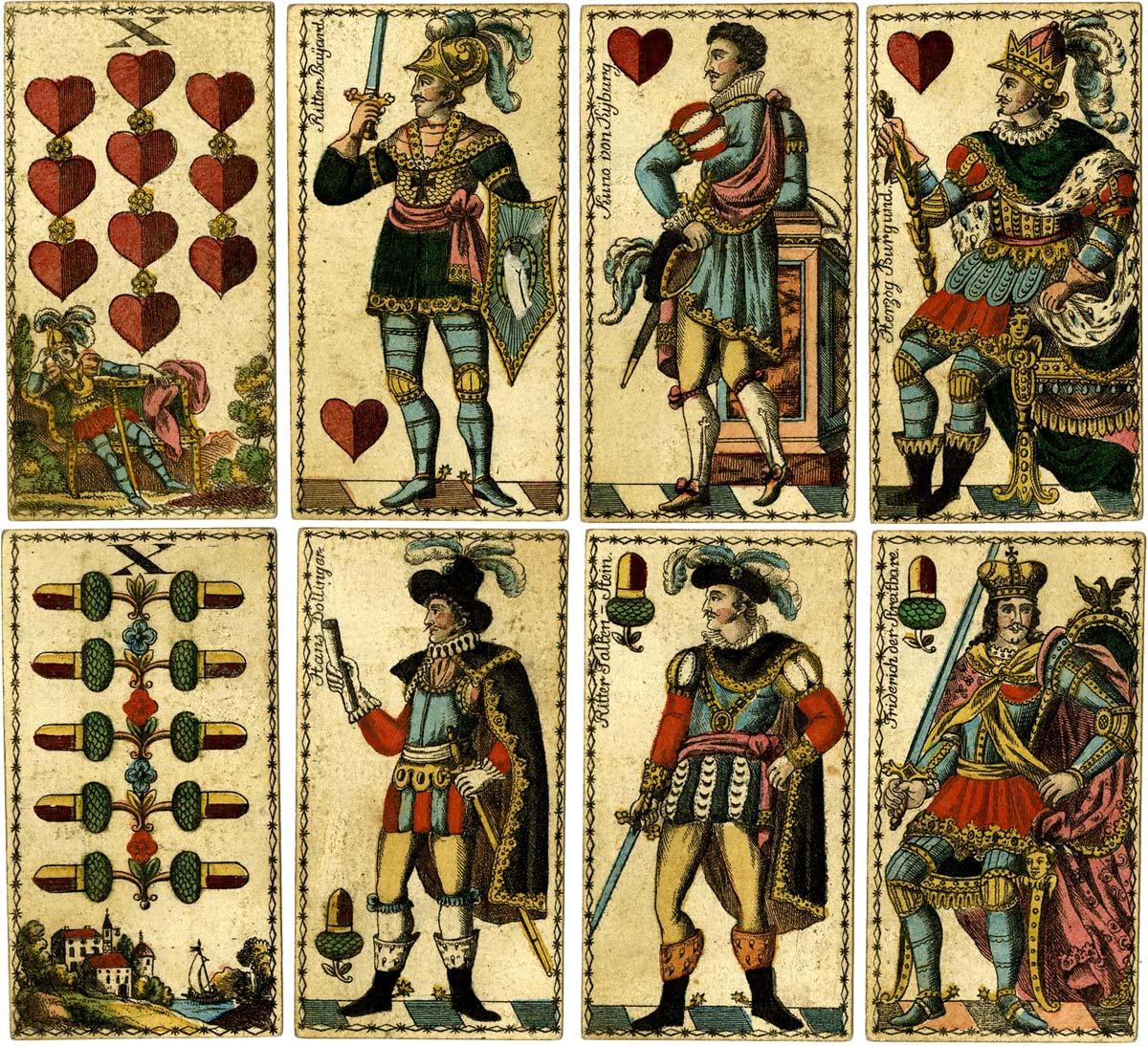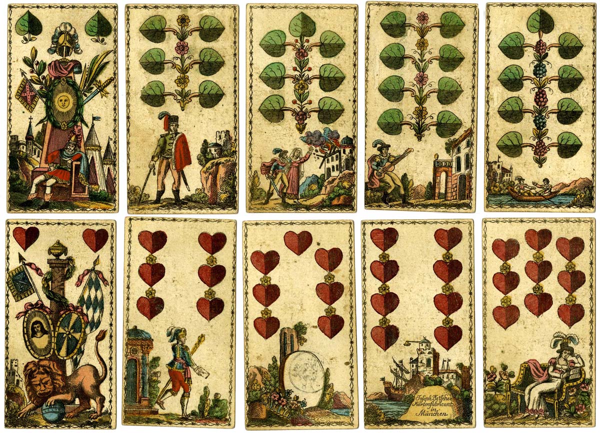 German-suited playing cards, illustrated with full-figure historical characters on the courts and vignettes on the numeral cards alluding to various events, produced by Joseph Fetscher, Munich, c.1820. “Ritter Bayard”, “Kuno von Kyberg”, “Herzog Burgund”, etc. The deuce of hearts has the arms of Munich arranged as a trophy and the 8 of hearts is lettered “Joseph Fetscher Kartenfabricant in München”. All the cards have a decorative border.