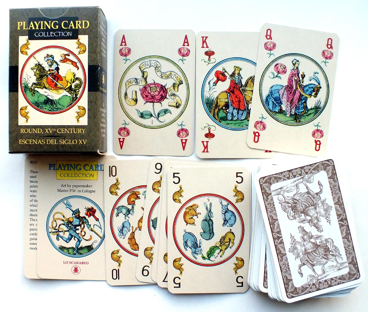 Above: Master PW Circular Playing Cards (1499-1515 approx. dates of activity). The five suits, rather than the customary four, are: Hares, Parrots, Carnations (or Pinks), Columbines (or Aquilegias) and Roses. The total number of cards is 72; diameter = 70 mms (outer borderline). All seventy-two of Master PW's designs have survived in from one to six impressions, but no single repository owns a complete deck. Copies are preserved at: Bologna (sixty-nine cards) and Dresden (fifty-two); the British Museum, London; Vienna; Cologne, Rothchild Collection, Paris; Amsterdam and Boston. The British Museum makes its collection database available to be used by scholars across the world.