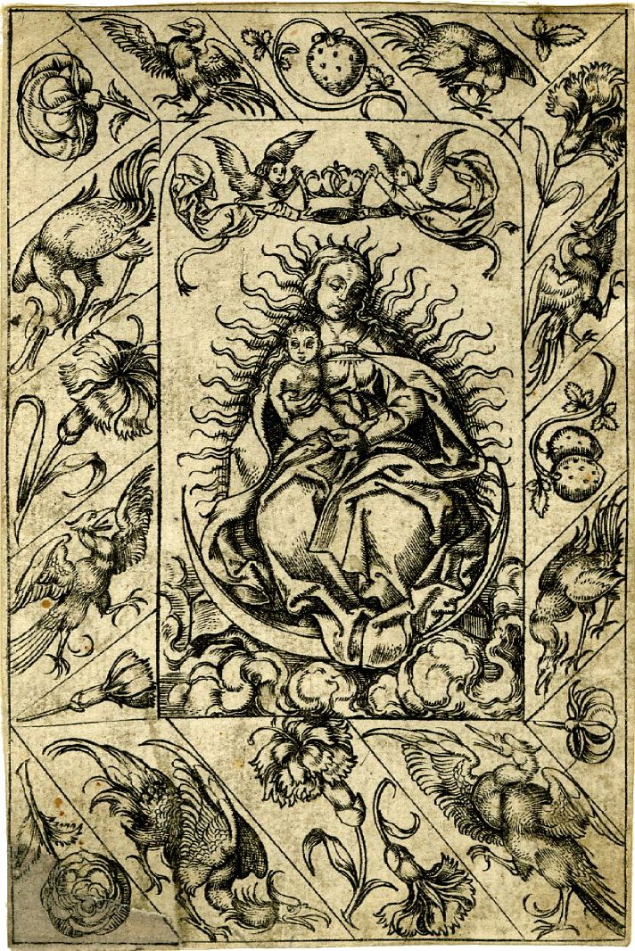 The engraving of lines in metal in order to print on paper developed from the goldsmith's long-established practice of decorating metal with engraved patterns. The technique was first used for printing on paper in the second quarter of the fifteenth century. It was considered the most noble and appropriate technique in which to render the work of great masters. Since none of Master PW's surviving cards are mounted on stiff card, the question arises whether they were actually intended for play. Although it is known that circular cards were used in India, the circular format was not the norm in the West. Of course, circular illustrations were known in the 15th & 16th centuries depicting occupations of the months and calendar illustrations. Likewise, naturalistic flowers, birds and animals occur in the borders of books of hours. We see here how the profane world of the medieval playing card had close connections with religious artwork.