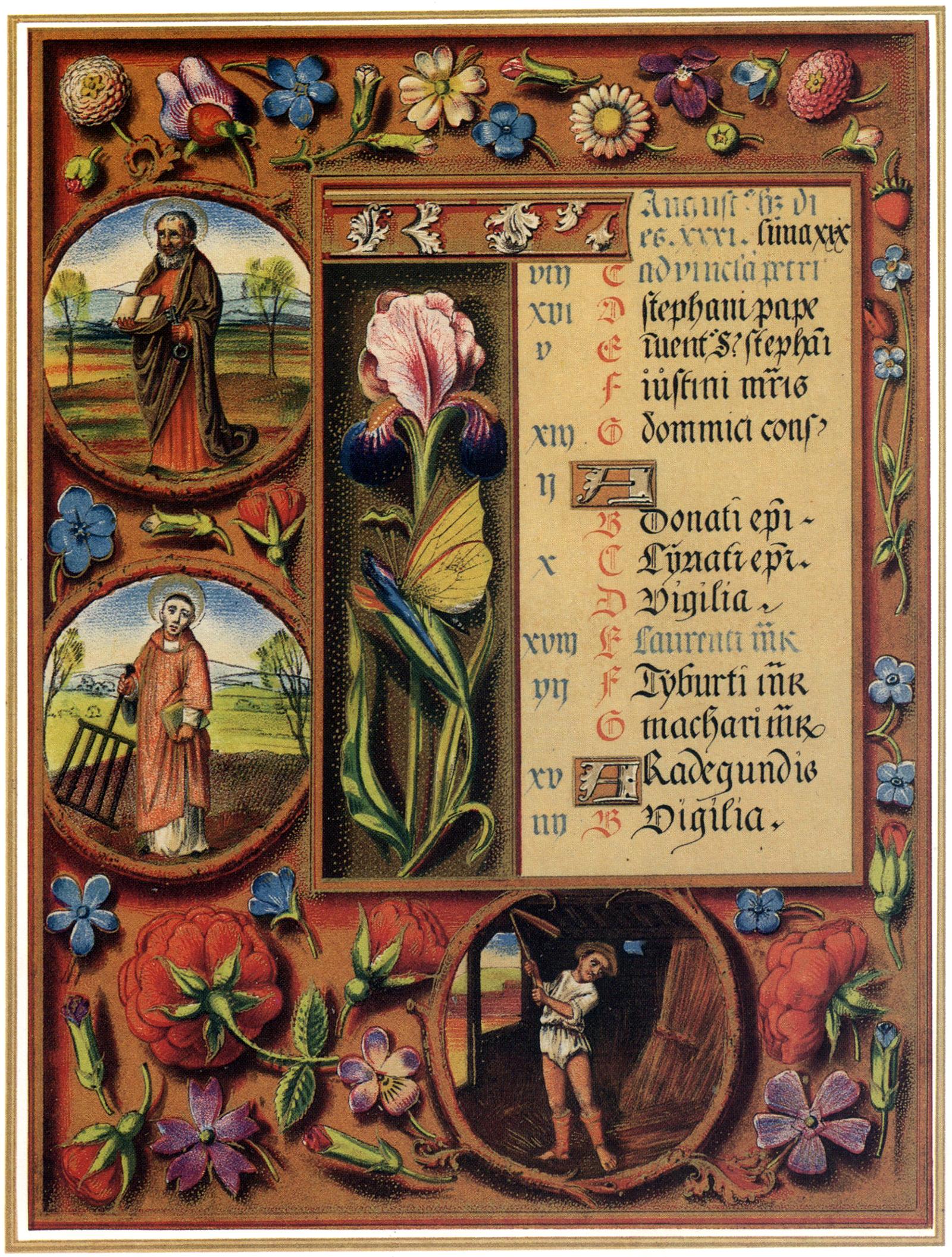 A style of manuscript illumination during the high Gothic period, around the late 15th / early 16th century, involved decorating the margins with a luxurious array of strewn flowers, fruits, small animals and insects, painted in a naturalistic style on a gold background. In the example of a Missal shown below, the roundels in the borders also contain miniature illustrations of saints of the month, each accompanied by an appropriate symbol by which he may be recognised.