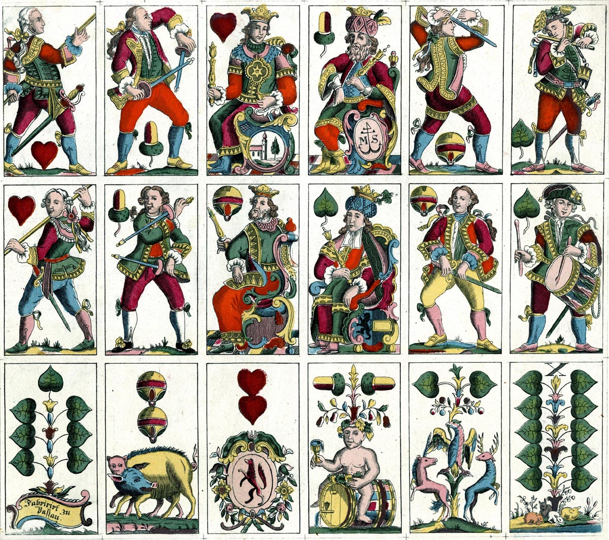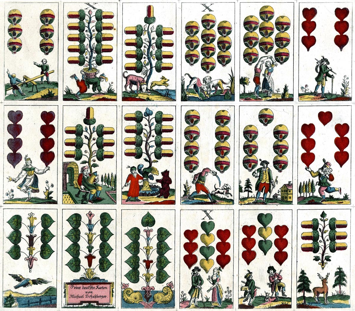 Above: uncut sheet of German-suited playing cards in the old Bavarian pattern, c.1790. The back of the sheet is printed in black with a pattern of fleurs-de-lis. The monogram M.S. (Michael Schatzberger, Passau) appears on the king of hearts. Image taken from Fisher (1946) where it is incorrectly assigned to Martin Schongauer.