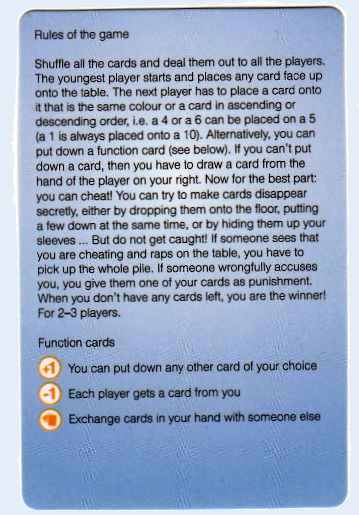 Munteres Mogeln (“Cheerful Cheating”) in-flight children’s card game produced for Lufthansa airlines by Spiriant GmbH. The deck comprises 4 suits each of 10 cards numbered 1 through 10, all with an identical comical image but different for each suit. The object of the game is to get rid of all your cards... and cheating is permitted. See the Rules►