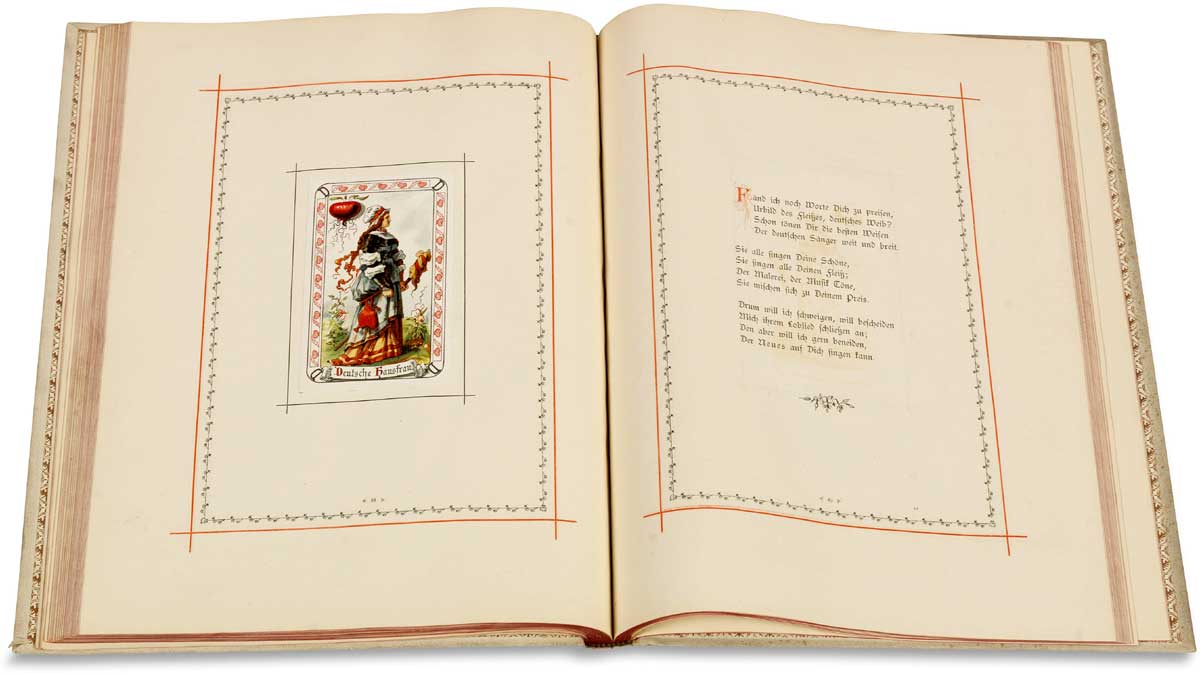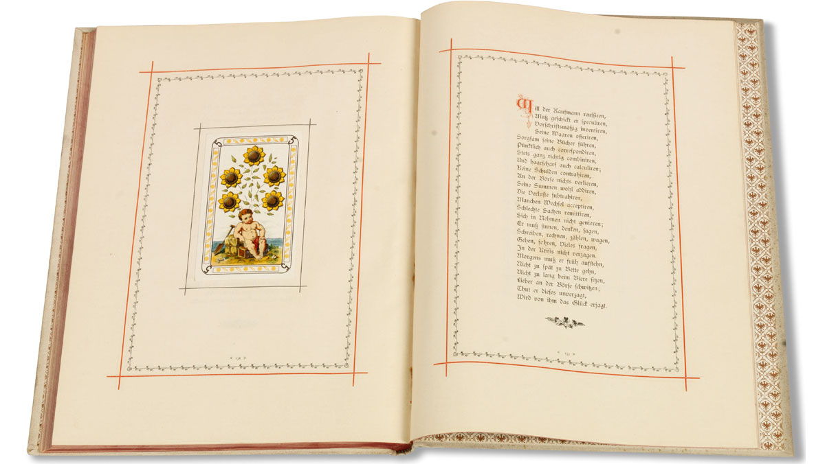 The drawings were also published in book form, including four queens and all the number cards 2-10, as 56 colour lithographs accompanied by verses, printed by W. Drugulin, Leipzig, 1883 more →