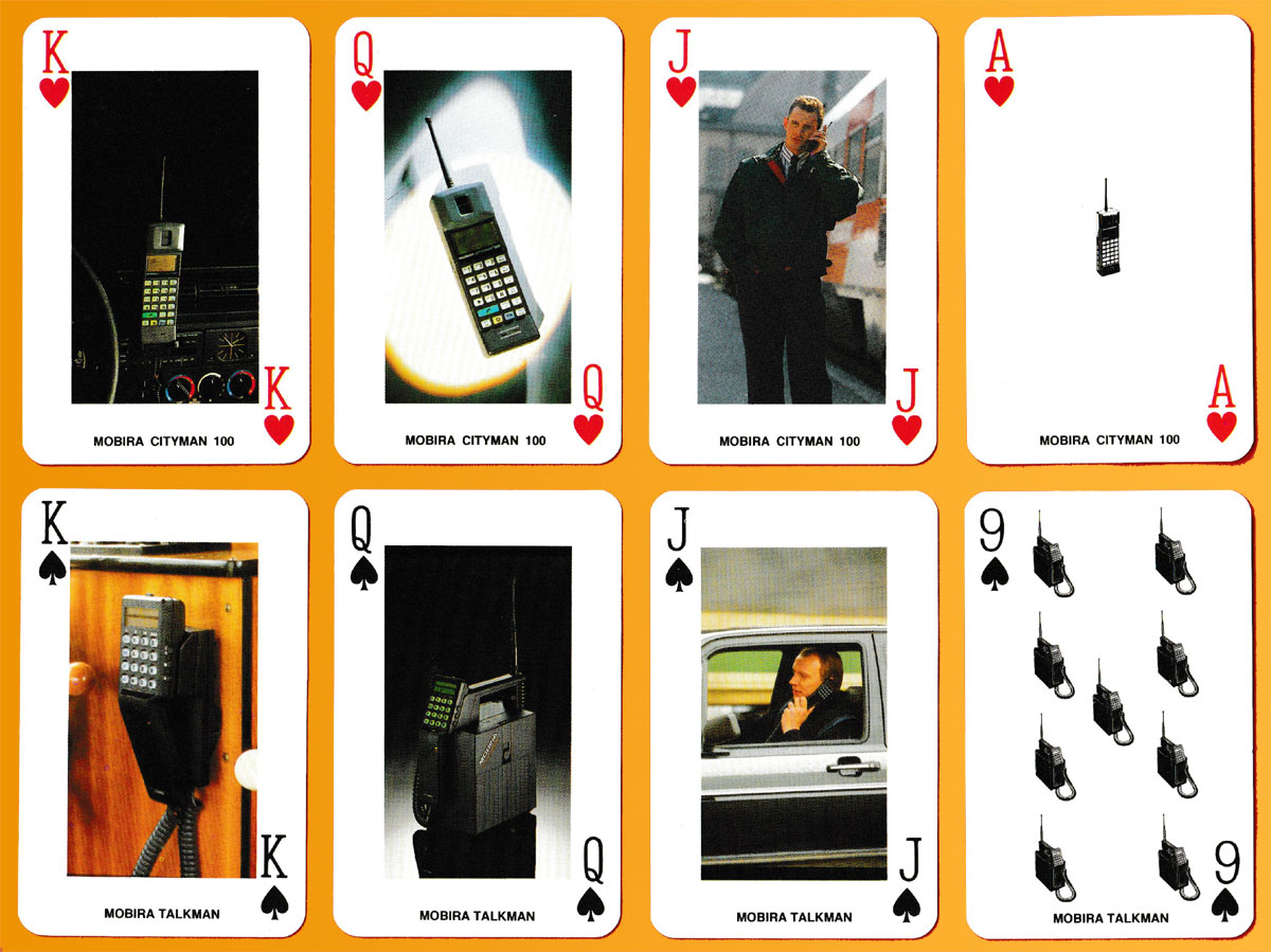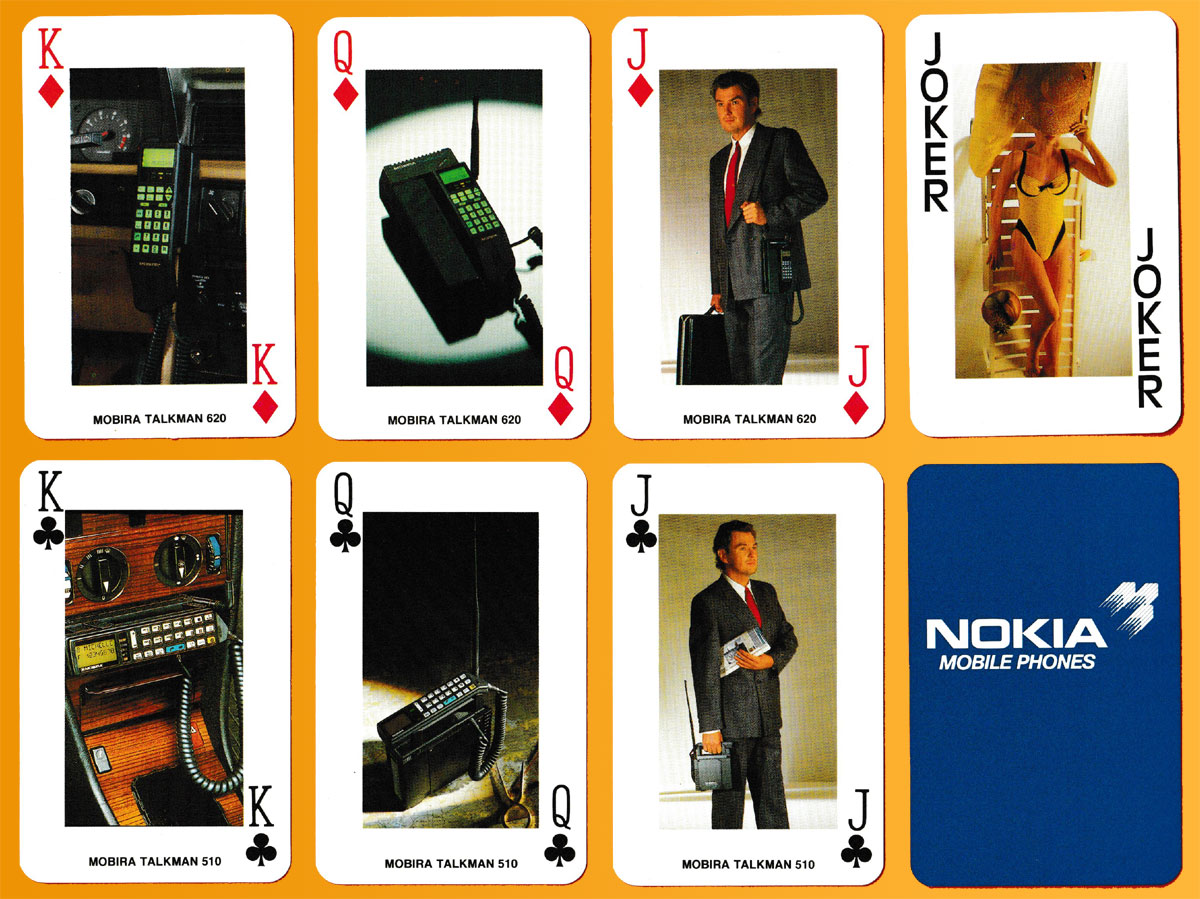 Above: Advertising pack for Nokia mobile phones made by Berliner Spielkarten, Darmstadt, Germany, 1990. 52 cards + 3 (identical) Jokers in clear plastic box. Size: 57 x 89 mm.