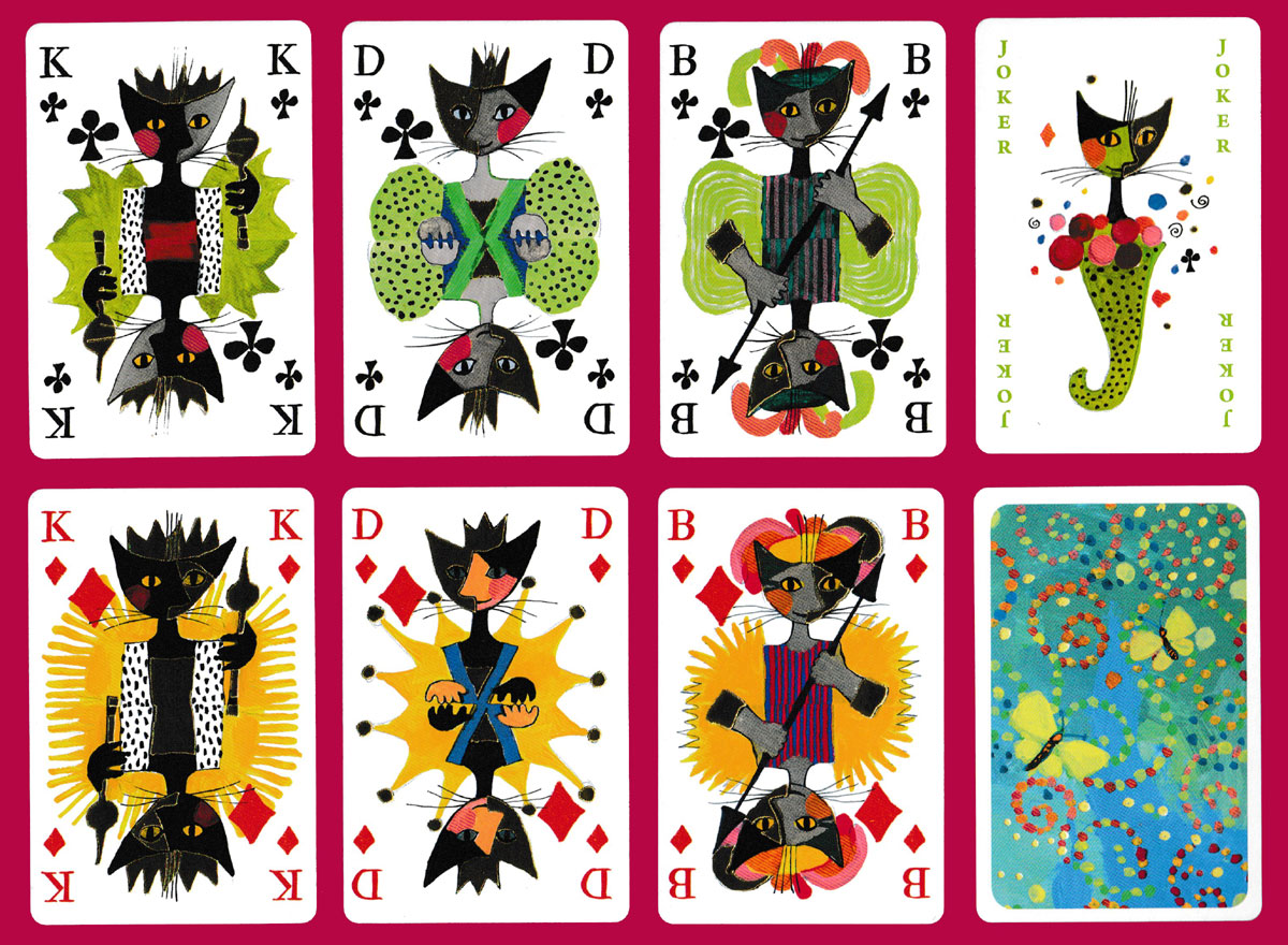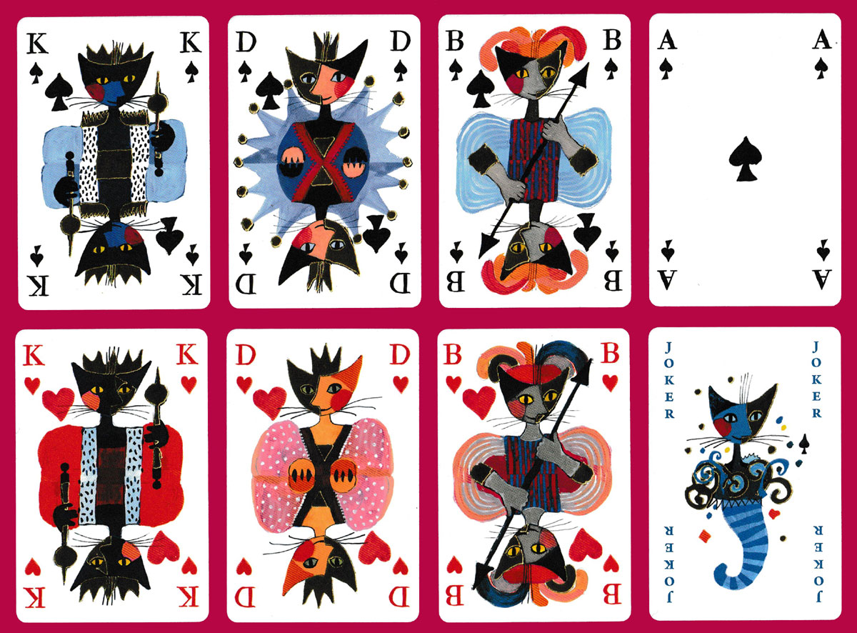 Rosina Wachtmeister was born in Vienna in 1939. In her teens she moved to Brazil with her parents, before finally settling in Italy in 1974. She is particularly well known for her paintings of cats with crescent moon-shaped heads, as in this pack. The cats generally have two faces, somewhat in the style of Picasso. Metallic gold ink has been used on the court cards, Jokers and box, giving the cards a luxury feel. (Unfortunately, the gold shows up more as black on the scans). The indices are in German. See the box►