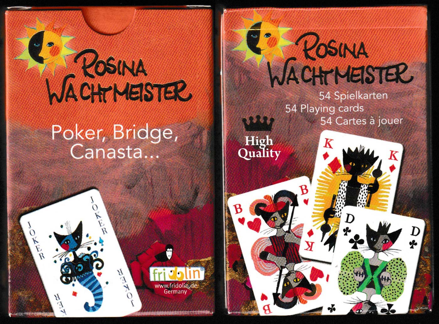 Above: Rosina Wachtmeister playing cards published by Fridolin GmbH, Herrenberg, Germany, c2015. 52 cards + 2 Jokers in tuck box. Size: 58 x 89 mm. Printed in China?