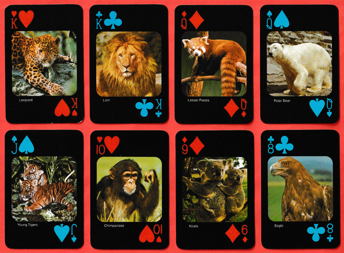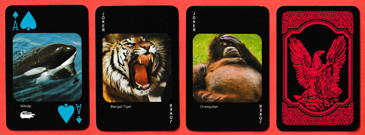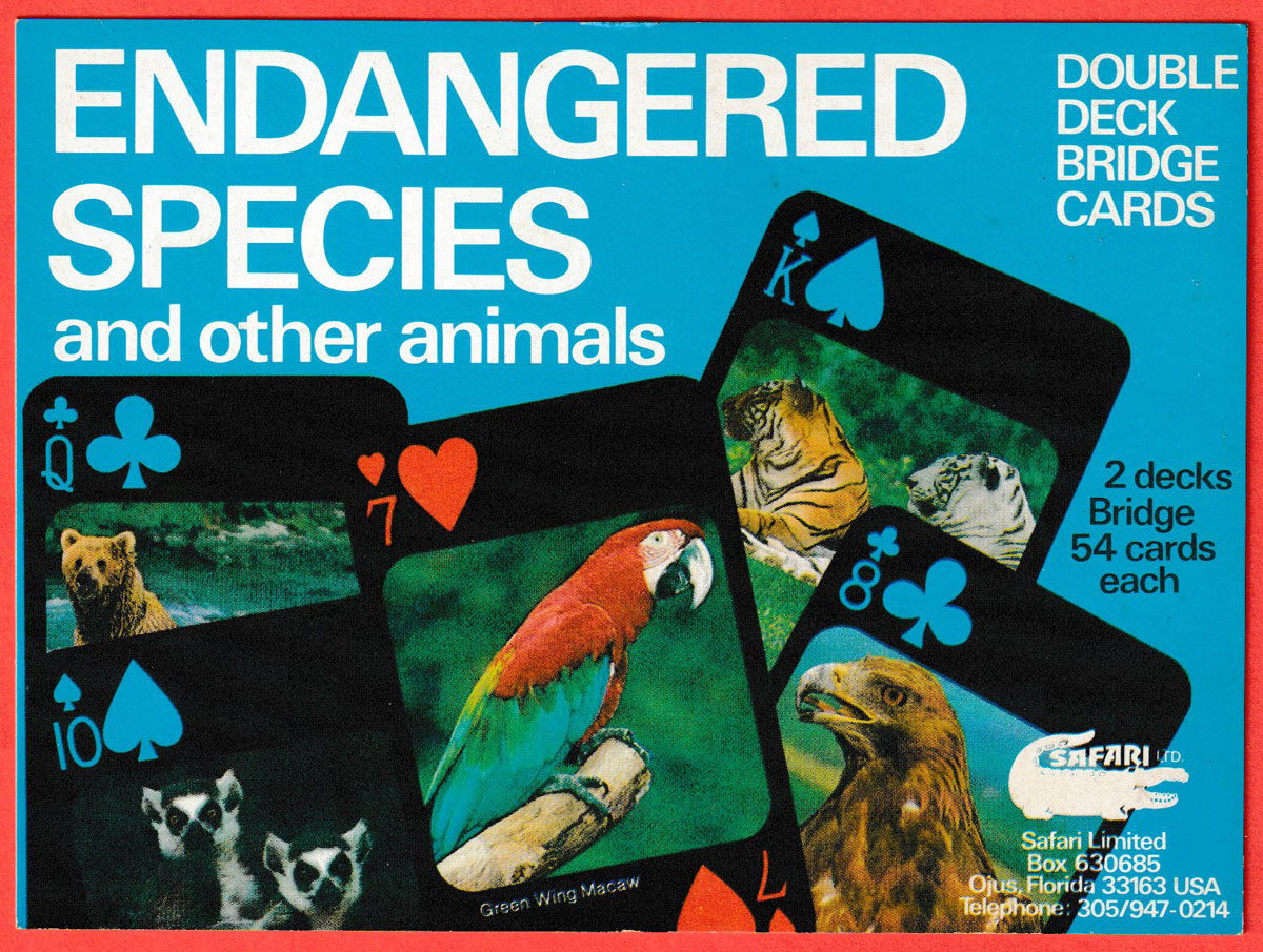 Above: 54 different endangered species depicted in full colour published by Safari Limited, Ojus, Florida, USA, c1986. Printed by F.X. Schmid, Germany, 52 cards + 2 Jokers + 1 bridge score card in plastic box. Size: 58 x 88 mm.