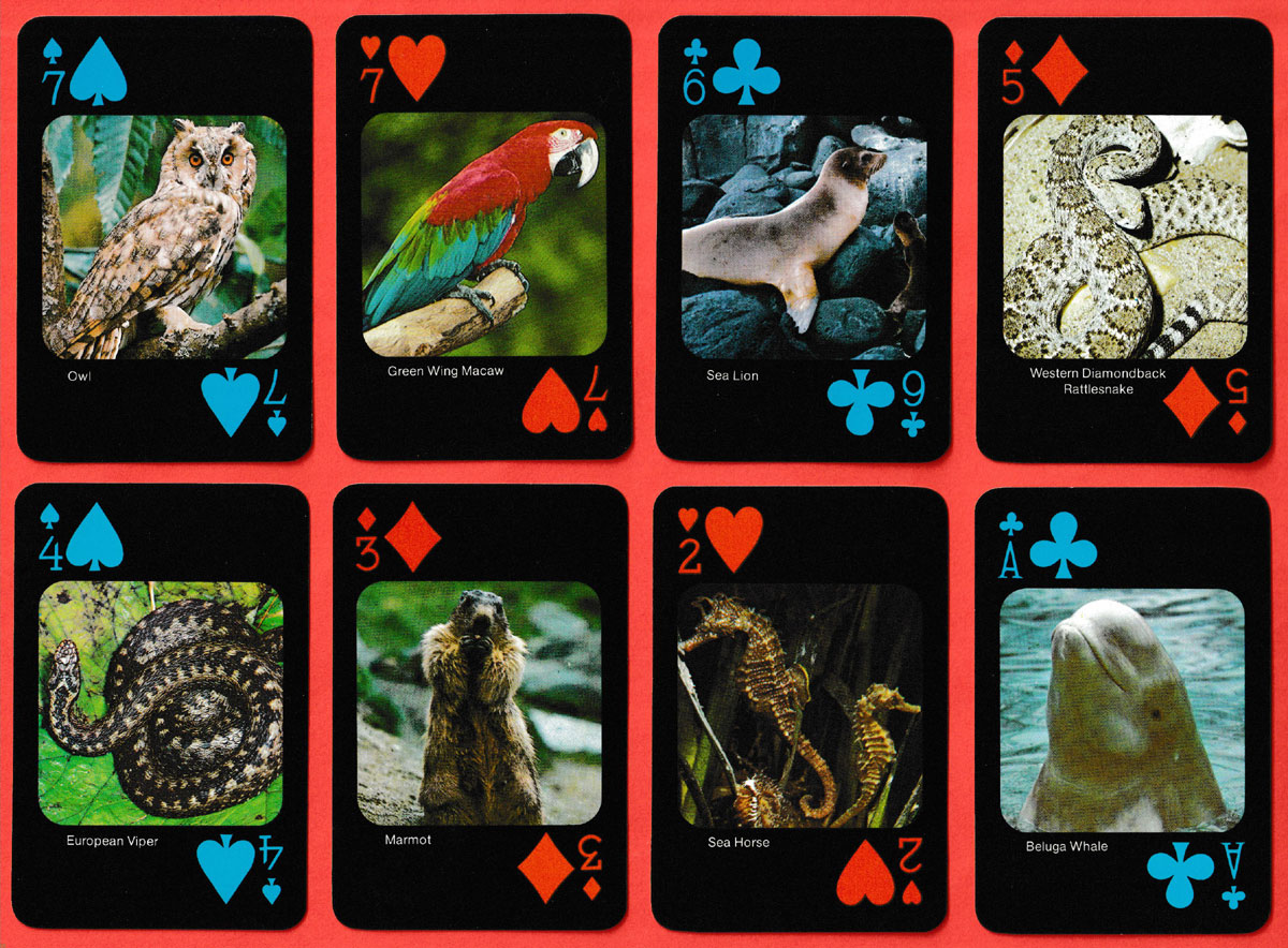 Each card in this pack depicts a different endangered species (animals, fish, birds, reptiles) in full colour against a black background. All the species are named. The black suit-signs are printed in blue. The publisher’s logo appears on the Ace of Spades. On the back is an eagle with outspread wings in red or blue against a black background.