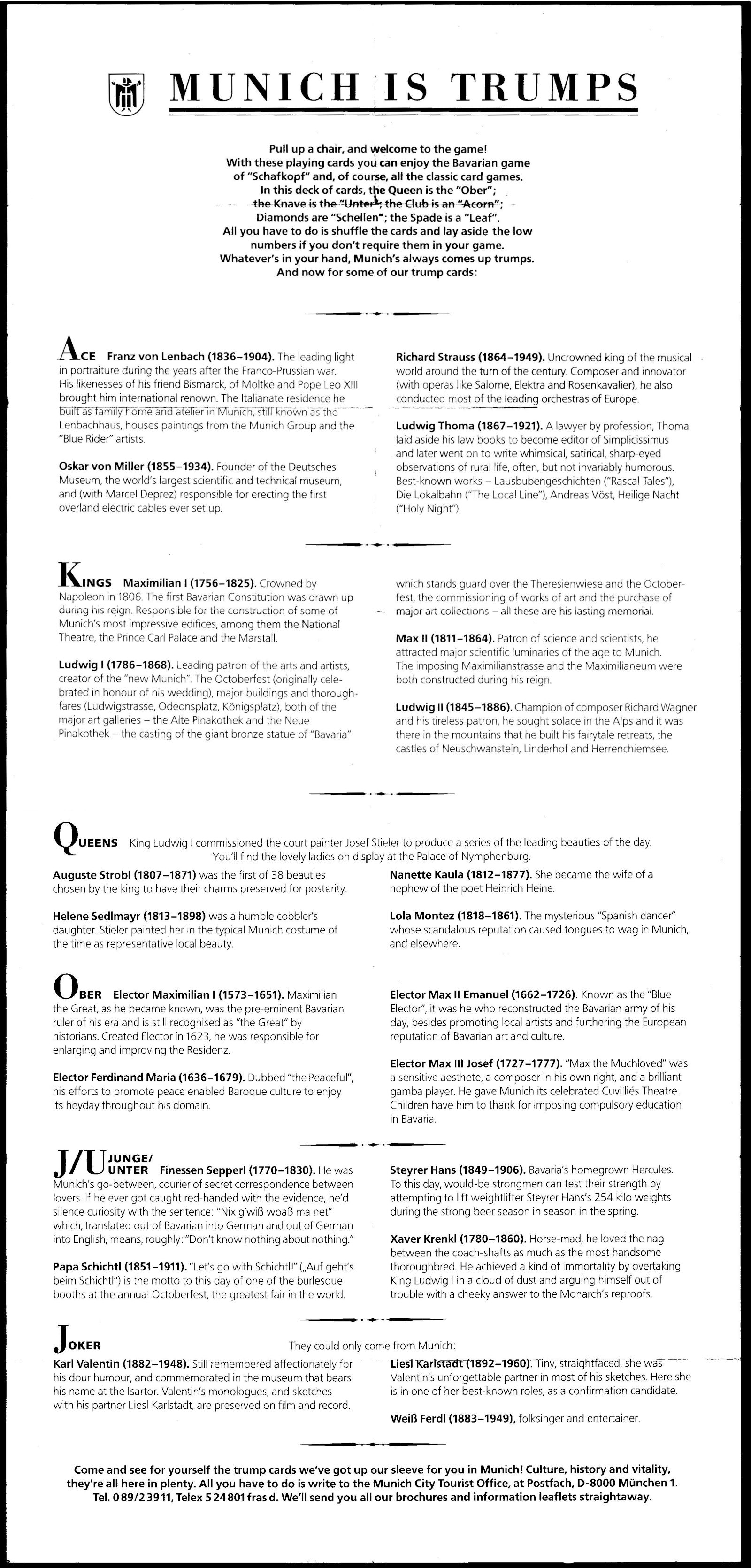 Above: Munich is Trumps playing cards created by H. Forster. Illustrated by Prof. G. Magnus and M. Keller. Printed by F.X. Schmid, Prien am Chiemsee, Germany, c1991. 52 cards + 3 Jokers + 1 extra card + leaflet in English, in clear plastic box. Size: 56 x 100 mm. Made for the Munich Tourist Office. Copyright: Edition Fremdenverkehrsamt der Landeshauptstadt München