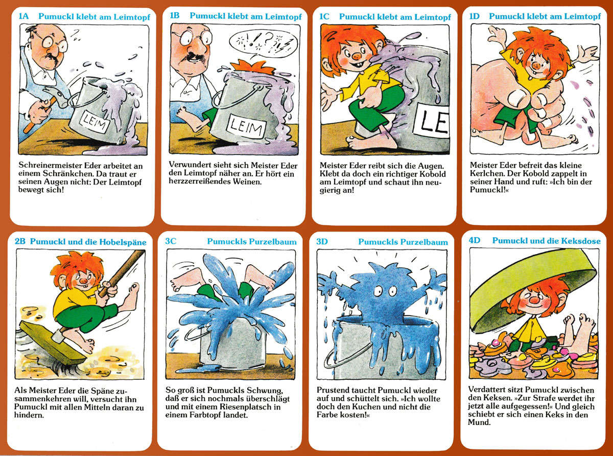 Above: Pumuckl quartet game made by F.X. Schmid, Prien, Germany, c1987. 32 cards + 1 title/rule card in plastic box. Size: 66 x 100 mm. © Buchagentur Mūnchen 1987.