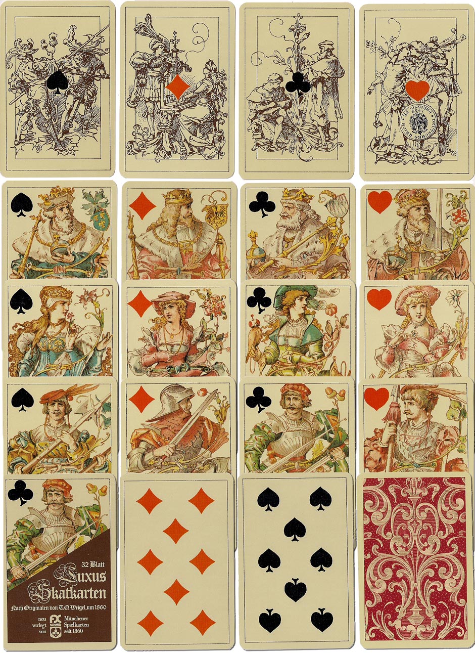 Above: reprint of T.O.Weigel's "Luxus Skatkarten" (c.1880), reprinted in facsimile by F.X.Schmid, Munich, 1981. 32 cards, no indices. It is odd that Schmid did not get the date right. They possibly confused father and son, both being artists and both having similar styles. The back design is not the original. The original backs are described as having a crown, an eagle and heraldic devices on a blue and beige field. An earlier facsimile was printed by von Wezel & Naumann, Leipzig-Reudnitz, in c.1935. Schmid produced a later facsimile, identical to this one except that indices were overlaid.