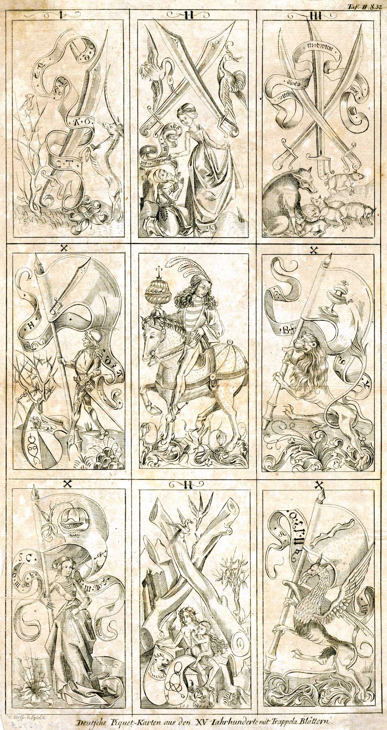 A sheet with facsimile illustrations of nine cards appeared in Johann Gottlieb Immanuel Breitkopf’s “Ursprung der Spielkarten”, 1784.