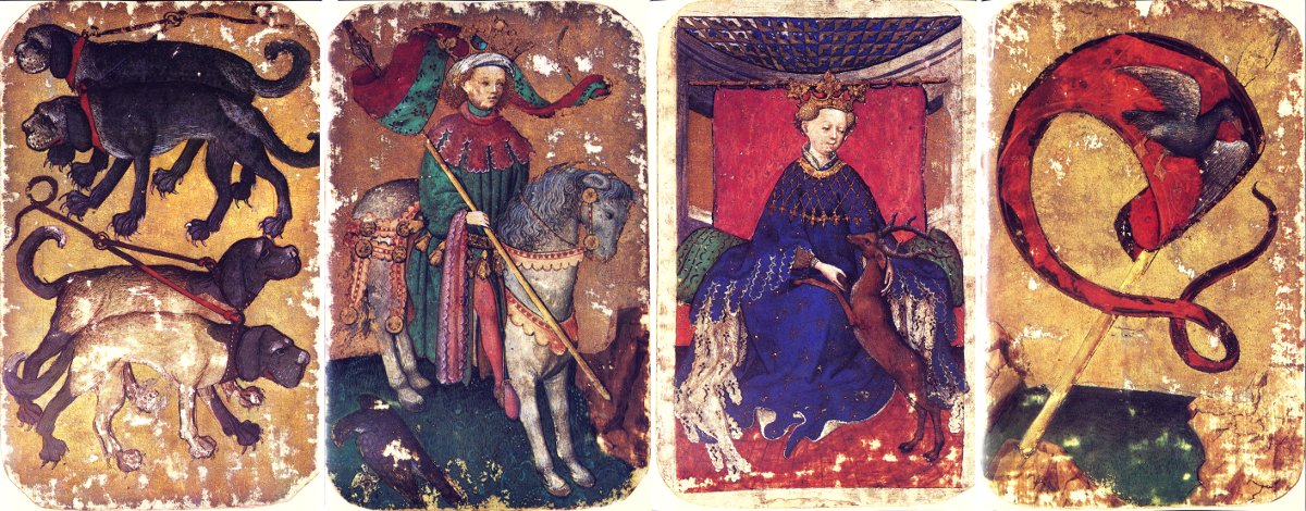 The luxury, hand-painted Stuttgart Cards (Stuttgarter Kartenspiel) dated c.1430, with suits of ducks, falcons, stags and hounds.