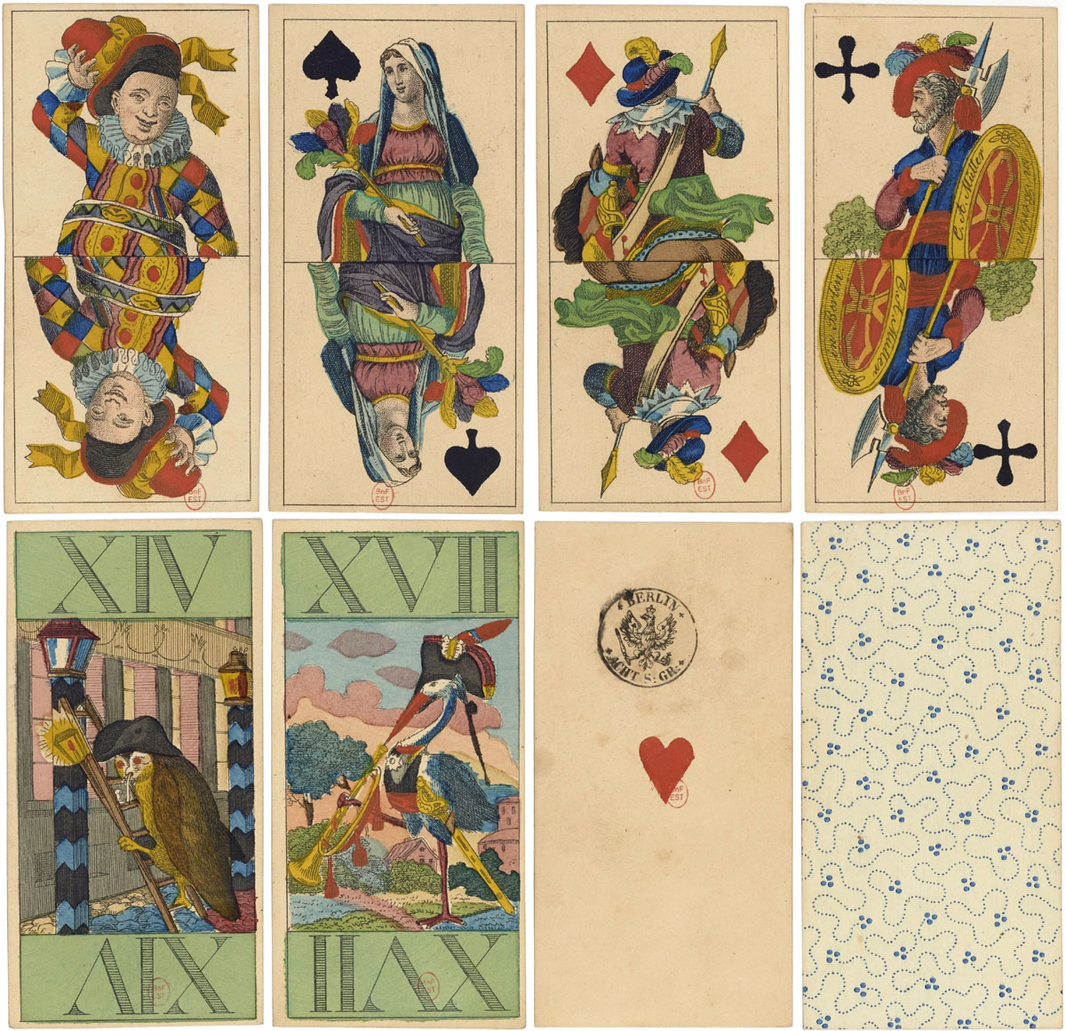 Above: fantasy tarot deck known as "Verkehrte Welt" published by C. A. Müller in Berlin, c.1840. 78 cards, stencil coloured etching; 10,5 x 5.3 cm. The tax stamp on the Ace of Hearts reads : “Berlin // Acht S. Gr.” The backs have a trefoil and wavy lines design dotted in blue. Source gallica.bnf.fr / Bibliothèque nationale de France • “Verkehrte Welt” tarot published by C. A. Müller, Berlin, c.1840►