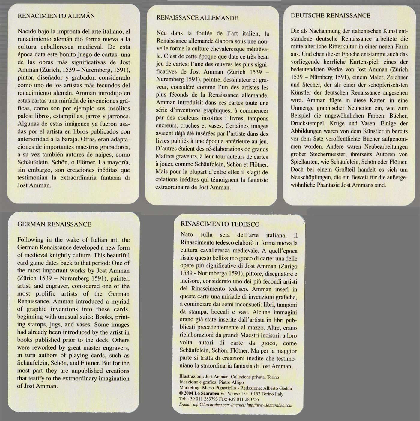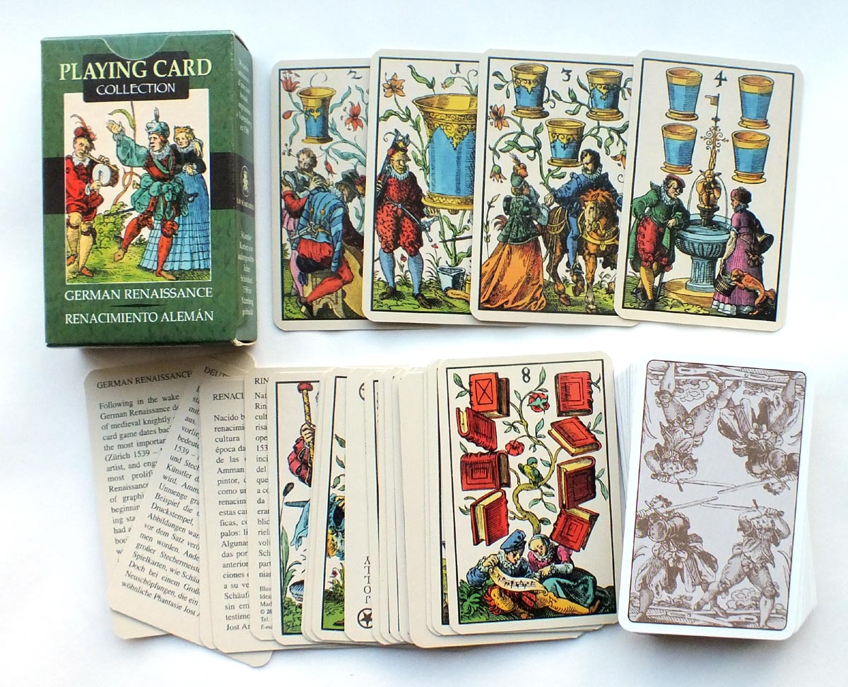 Following in the wake of Italian art, the German Renaissance developed a new form of medieval knightly culture. Imaginative decks of playing cards were produced by Jost Amman, Schäufelein, Schön and Peter Flötner...
