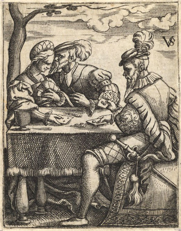 Below: Two men and a woman playing cards, engraving by Virgil Solis • Metropolitan Museum Object Number: 2012.136.759►