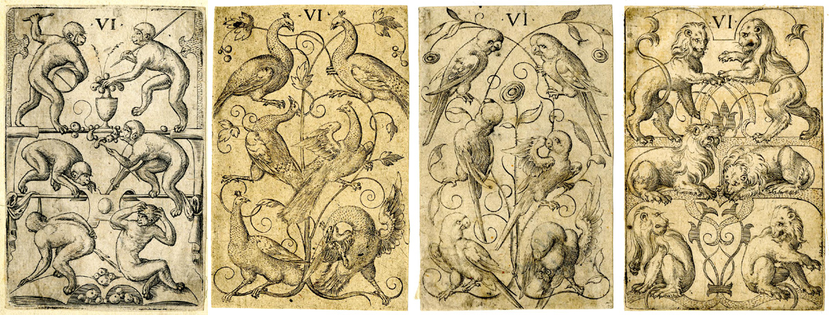 He produced this remarkable pack of 52 ornamental playing-cards in c.1544-50, showcasing his skill and meticulous attention to detail. Intricate designs and motifs such as leaves and flowers support the suit symbols. The four aces contain the cipher VS. The suit symbols characteristic of German cards in those days have been reassigned on the aces as monkeys for acorns (aicheln), peacocks for leaves (Graven), parrots for hearts (Rot) and lions for bells (Schelen). The pip cards in each suit run from 1 to 10 with their values in Roman numerals at the top; the court cards are a foot soldier, mounted Queen and mounted King (no uber and ober). Thus in several aspects the pack does not conform to a typical German pattern, which suggests that maybe the pack was “not intended for the commonality” (Willshire p.217). The monkeys, peacocks, parrots and lions reflect Solis’s interest in natural history and exotic creatures, which were popular subjects in Renaissance art, instead of employing the more rustic acorns, bells, hearts and leaves.¹