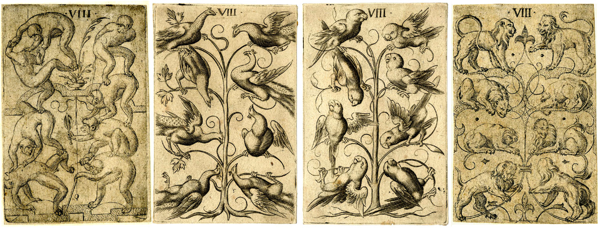 Remarkable pack of 52 animal-suited playing-cards designed and etched by Virgil Solis.