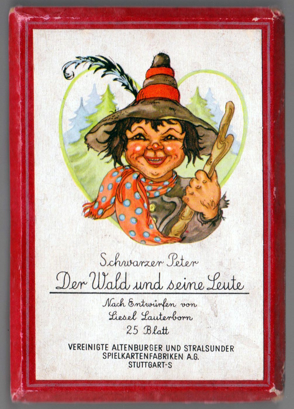 Above: “Schwarzer Peter Der Wald und seine Leute” card game illustrated by Liesel Lauterborn, manufactured by Vereinigte Altenburger und Stralsunder Spielkarten-Fabriken AG, 1955. 25 cards (12 pairs + Schwarzer Peter) + rules + extra card in illustrated box. Other editions are known (e.g.: Ariston Spielkartenfabrik GMBH Detmold).