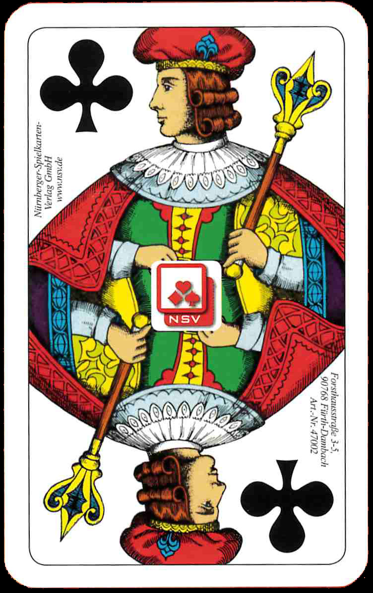 The deck follows the Austrian large-crown Wiener pattern, beginning at the 9s. The Jack of Clubs in this edition includes NSV’s logo, full company name, and article number, clearly identifying it as an NSV production.