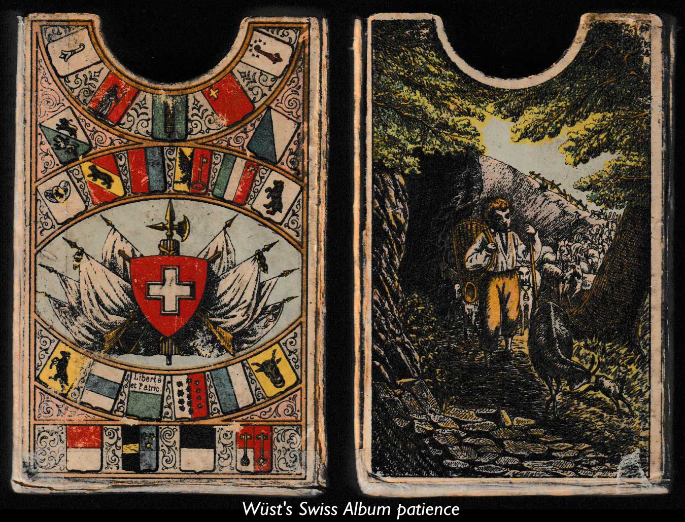 Above: Swiss Album patience No.90 manufactured by C. L. Wüst (Frankfurt), c.1900, with a different landscape on the reverse of each card inside a decorative oval frame. The court cards depict costumed figures along with shields from the cantons and the aces are scenic. 52 cards in box.