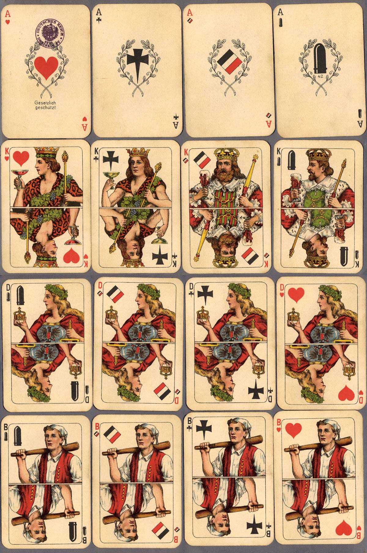 Wüst prepared cards with the King as a portrait of Caspar Wüst; the Queen as Mathilda Wüst and the Jack, Mathilda’s husband Hermann. In Germany the game of Skat resulted in intense competition between playing card manufacturers. Wüst countered with a unique double figure pack of cards split in the diagonal, the first Wüst standard pattern.